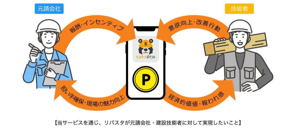 当サービスは、元請会社の判断で建設技能者に対し簡単にポイントを付与することができます。建設技能者は、元請会社の設定する条件を満たすこと(例:安全講習会への参加、日々の入退場認証やCCUS-建設キャリアアップシステム-カードのタッチ、改善提案を行うこと等)で、当アプリを通じてポイントを受け取ることができます。ポイント付与の方法はシンプルで、まず元請会社はポイント付与の条件を自身の裁量で自由に設定します。例えば、リバスタが提供する建設現場施工管理サービス「Buildee入退場管理」の就業履歴データと連携させることで、入場者に一律でポイントを自動付与するなど、きめ細かな対応が可能です。受け取ったポイントは建設技能者が個人のPayPayアプリ上で、PayPayマネーライトとして提携サービスや加盟店での決済に用いることが可能です。利用者からは「ノベルティなどをもらうより、自分で好きなものを買える仕組みがうれしい」と高い評価を得ています。