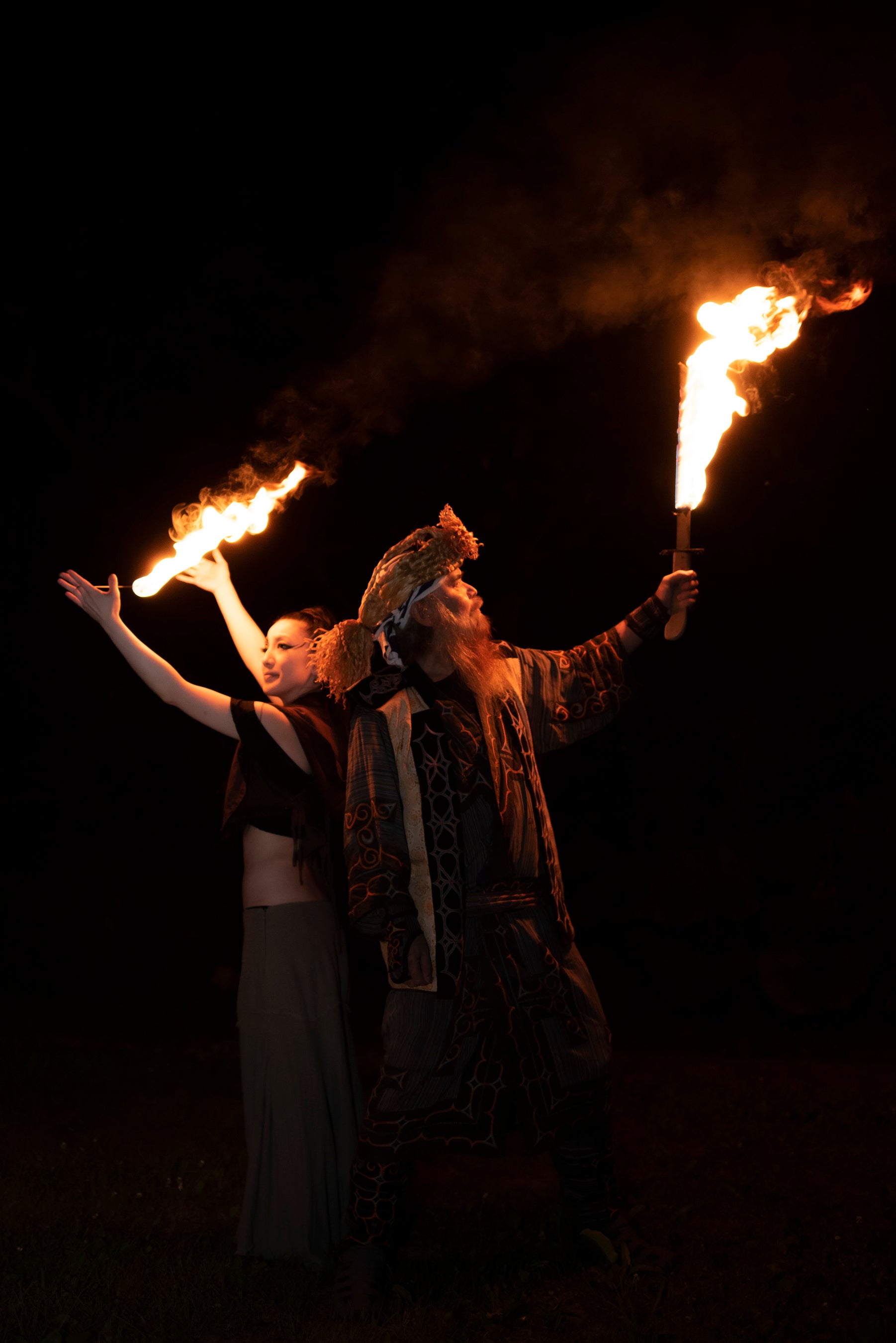 花火を背景に、楽曲に合わせた炎のパフォーマンスを披露します。メノコさんの群舞も必見です。