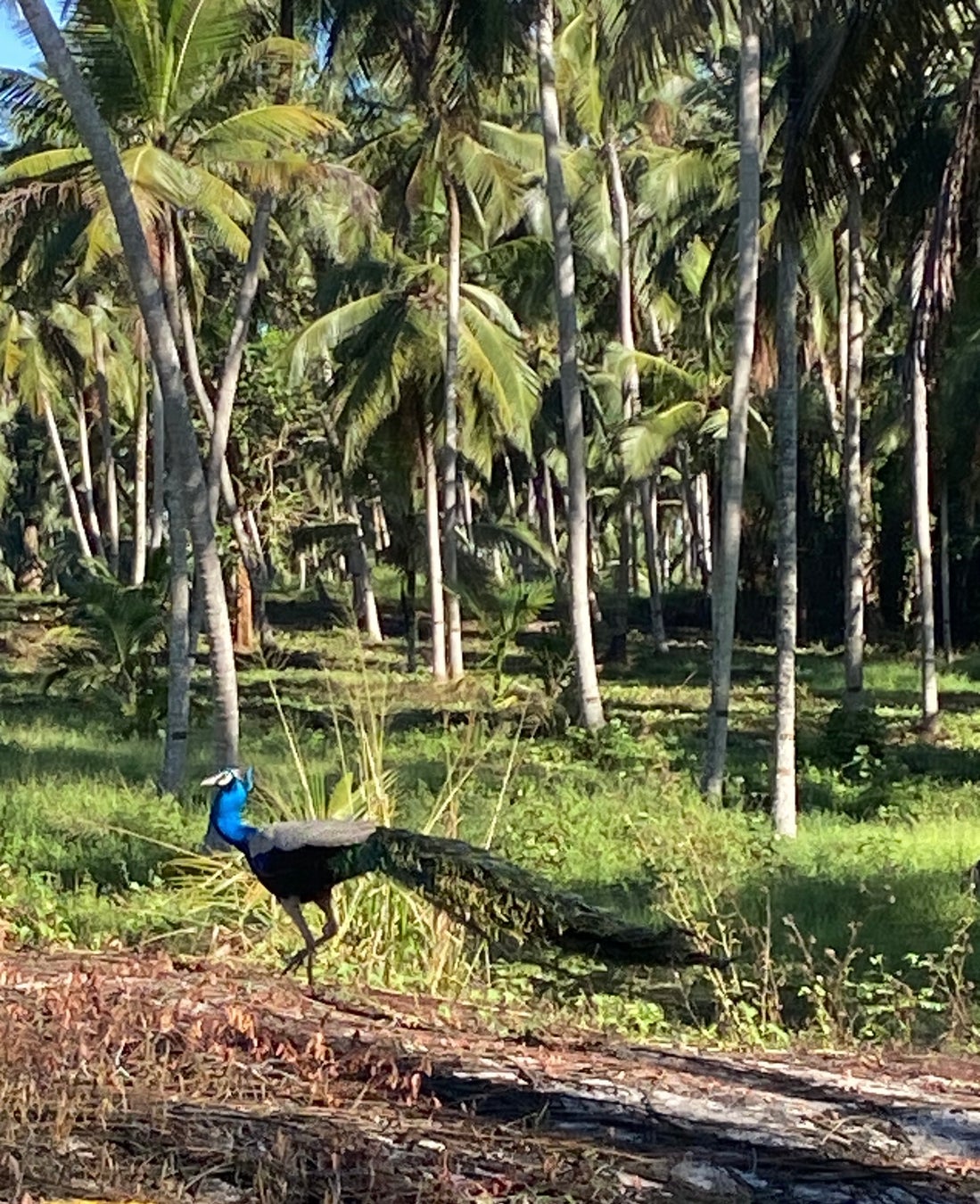 道路わきの草むらに大きなオスのクジャクを見つけました。ゆっくり歩いたり長い尾羽をなびかせながら飛んだりしている姿を見れるとスリランカに来たんだなあ、と実感できます。