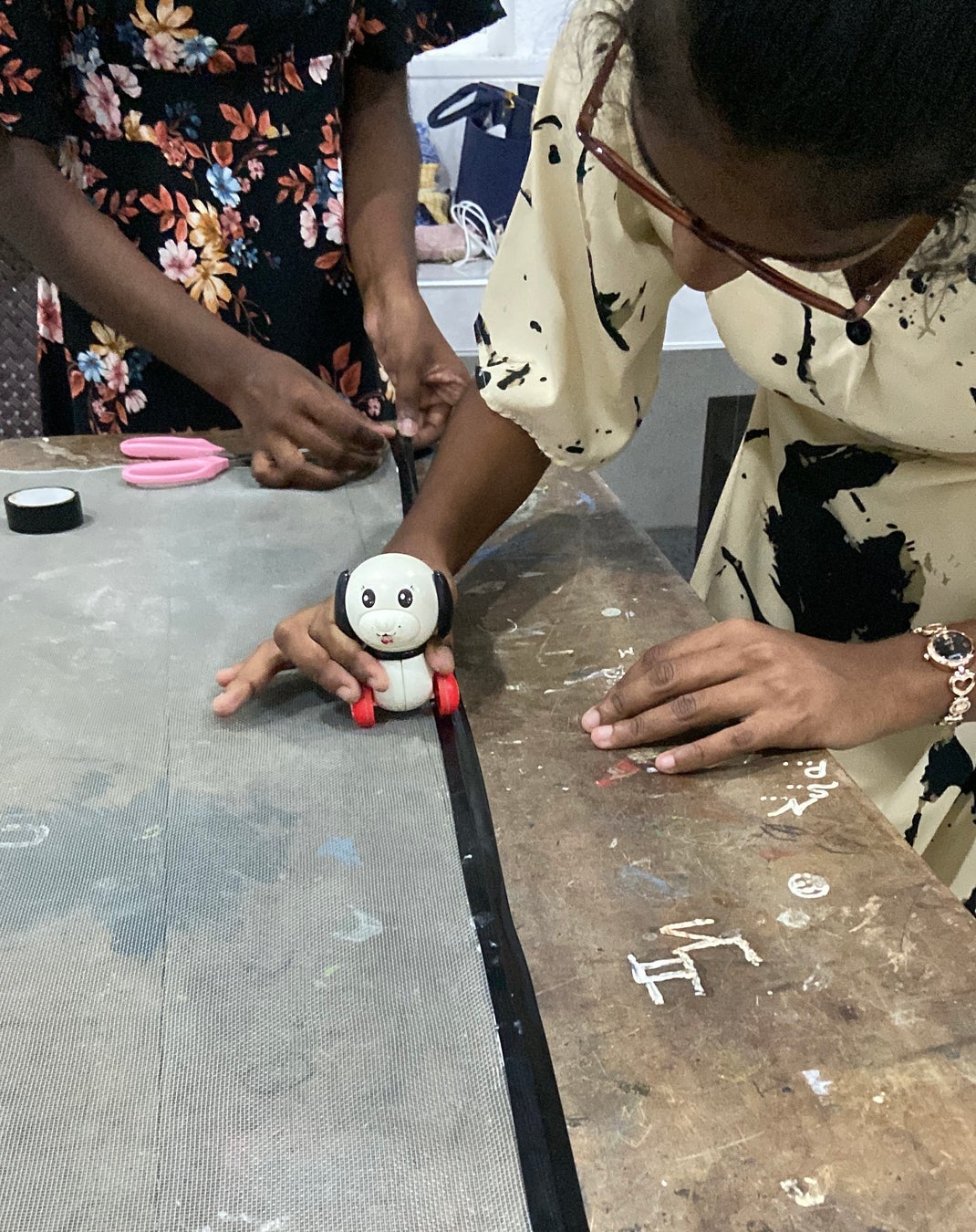 AMIDOの材料は一通りそろいましたが、使う道具の内、「小型ローラー」だけは、どこの店を探しても見つかりません。ですがここはスリランカ。物がなくてもなんとか工夫して乗り切る国です。ミラーディさんが「これを使いましょう!」と持ってきたのは車輪付きの犬のおもちゃでした。