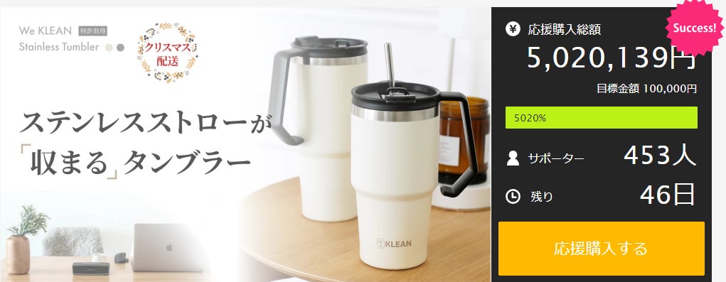 【応援購入総額500万円を突破】実施中のプロジェクトが多数のご支援を頂いております。(特許取得!ステンレスストローが飛び出す。大容量ハンドル付き保温保冷タンブラー)