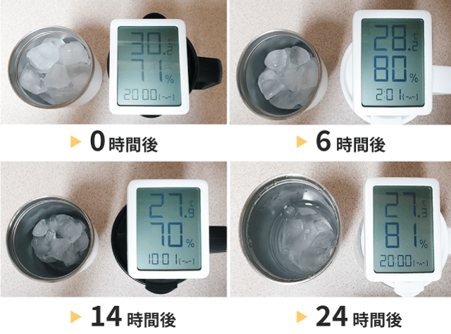 上記の画像のように、24時間経過しても氷が残るほど温度を保つ力が強いです。