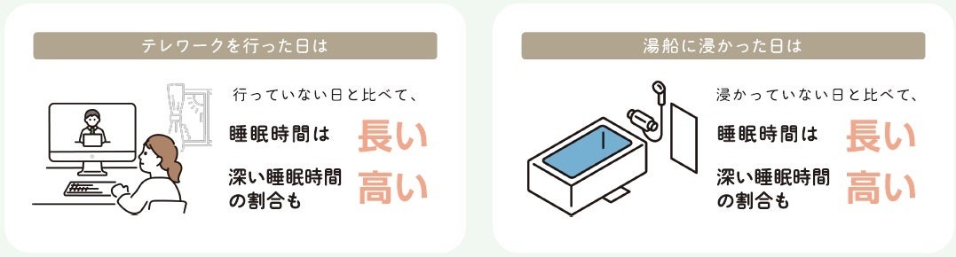 テレワークを行った日の睡眠記録は、行っていない日と比べ睡眠時間が長く、深い睡眠の割合も高いことが判明。テレワークを行った日の睡眠記録は、入浴時に「湯船に浸かった」割合が4.1%高いことに加え、湯船に浸かった場合は浸かっていない場合よりも、睡眠時間は長く、深い睡眠の割合も高いことから、テレワーク実施による移動時間等の削減が、睡眠に好影響を及ぼしていると推察される。