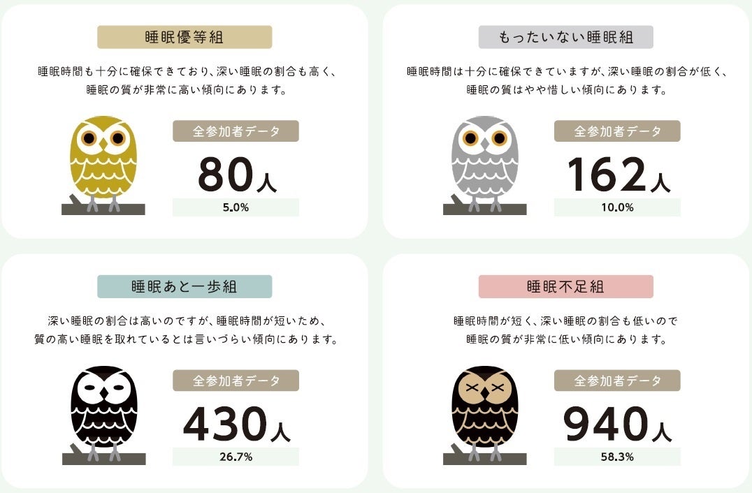 本運動期間中に14日間計測を行った参加者には、計測した睡眠データを基に個人レポート結果がアプリ内で表示されます。このレポートでは「睡眠時間の長さ」と「深い睡眠の割合」を基に睡眠タイプを4つの組に分類。その結果、睡眠時間が短く、深い睡眠の割合も低い“睡眠不足組”が4つの組の中で最多の58.3%となり、昨年度(36.1%)からも大幅に増加しました。