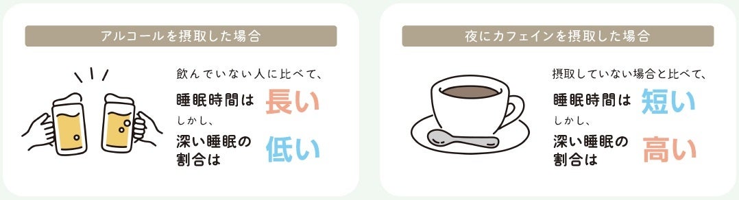 夜にカフェインを摂取した場合はしていない場合と比べて睡眠時間が短く、深い睡眠の割合は高い。