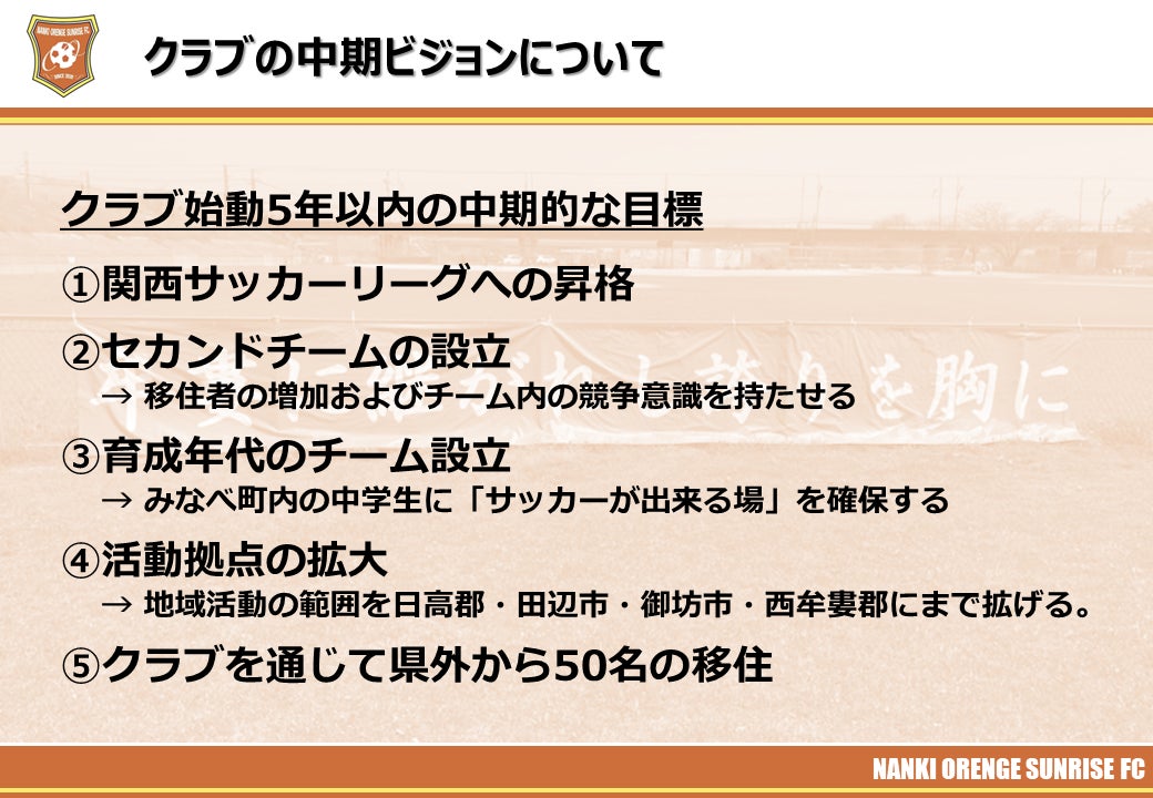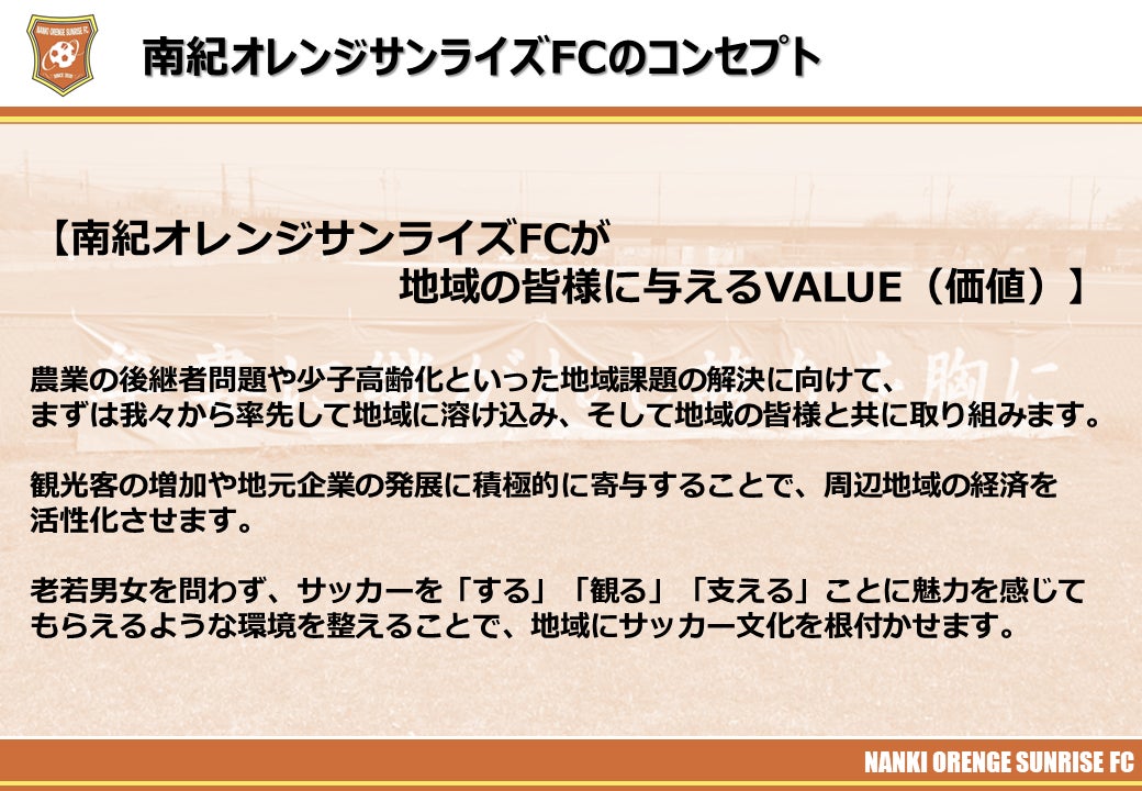 南紀オレンジサンライズFCは和歌山県の紀南地方を中心に活動をしているサッカークラブです。選手・スタッフが和歌山県外から移住をし、そこで農業を中心とした仕事に取り組みながら、サッカーだけでなく地域貢献活動も積極的に行うことで、周辺地域の活性化を目指します。