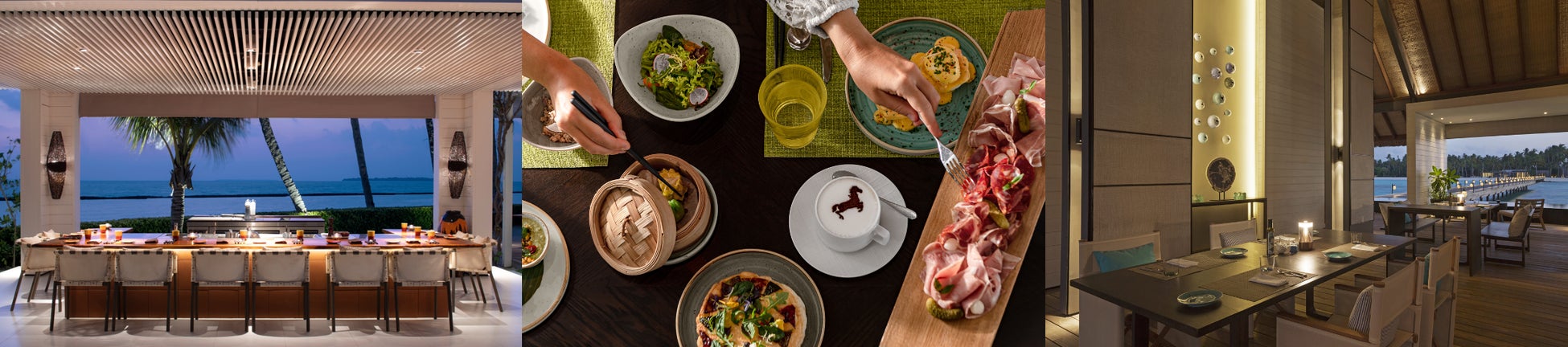 インド洋のテイストを取り入れたTHE WHITE(ザ・ホワイト)は、ラグーンを眺めながら砂浜でお食事ができるカジュアルな雰囲気のレストラン。LE 1947(ル・1947)は、サンテミリオン地区ボルドー右岸を代表する名門シャトー・シュヴァル・ブランにちなんだフレンチレストランで、12皿で構成されたテイスティングコースが週替わりで提供されます。また、水上レストランのTHE DEELANI(ザ・ディーラニ)は、地中海料理やイタリアン料理が楽しめます。アジアンテイストを味わいたい時には、日本食とアジア料理が楽しめるTHE DIPTYQUE(ザ・ディプティック)や、海に面した空間で、新鮮なシーフードや和牛をシェフがお客様の目の前で腕を振るうTEPPANYAKI(テッパンヤキ)がおすすめです。それぞれのレストランで、お客様のご要望に合わせた上質なグルメ体験をご堪能いただけます。お食事だけでなく、バーも充実しています。THE WHITE BAR(ザ・ホワイト・バー)では、プールサイドでカクテルや軽食が楽しめ、昼はハンモックでのんびりシエスタ、夜はロマンチックな雰囲気を味わっていただけます。また、THE SPA BAR(ザ・スパ・バー)では、ヘルシーフードやデトックスメニューをご用意しています。様々な種類のスーパーフードを使用したスムージーや栄養満点なメニューが豊富に揃っています。長期滞在のお客様を飽きさせない工夫をしています。