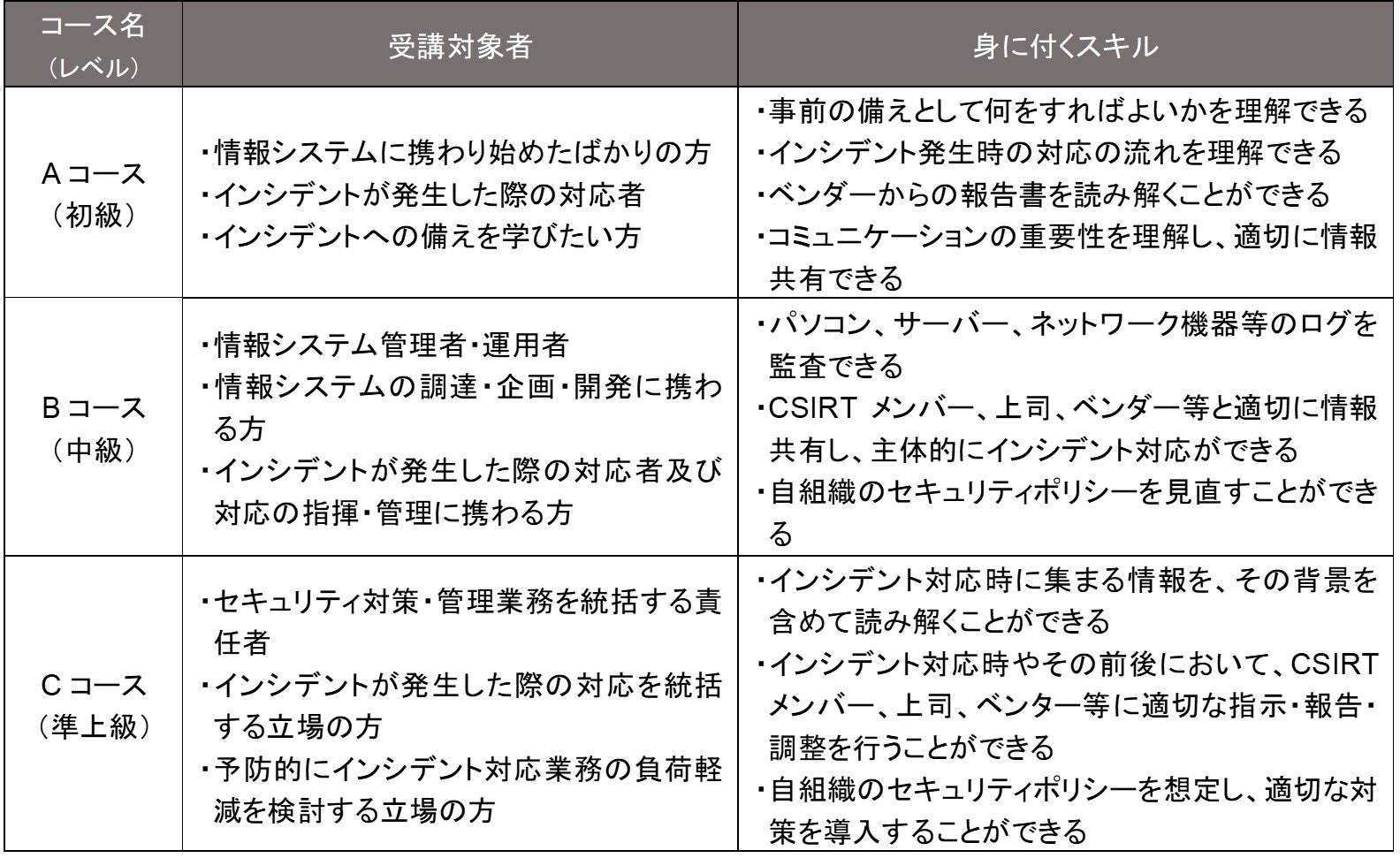会場で実施する「集合演習」は、グループでの検討課題があり、講師・チューターの即時のサポートが受けられる、CYDERの主流な演習形式です。学習レベル別で3コースを提供します。