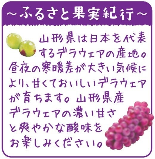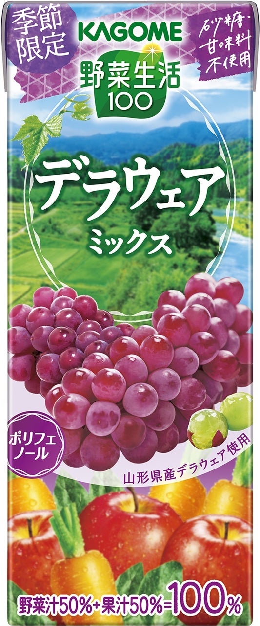 「野菜生活100 デラウェアミックス」は、山形県産のデラウェアを使用した野菜&果実100%ジュースです。山形県産のデラウェアの濃い甘さと爽やかな酸味をお楽しみいただけます。朝食のおともやリフレッシュしたいときにおすすめです。パッケージには日本三大急流である最上川が流れる朝日町の風景をデザインしています。