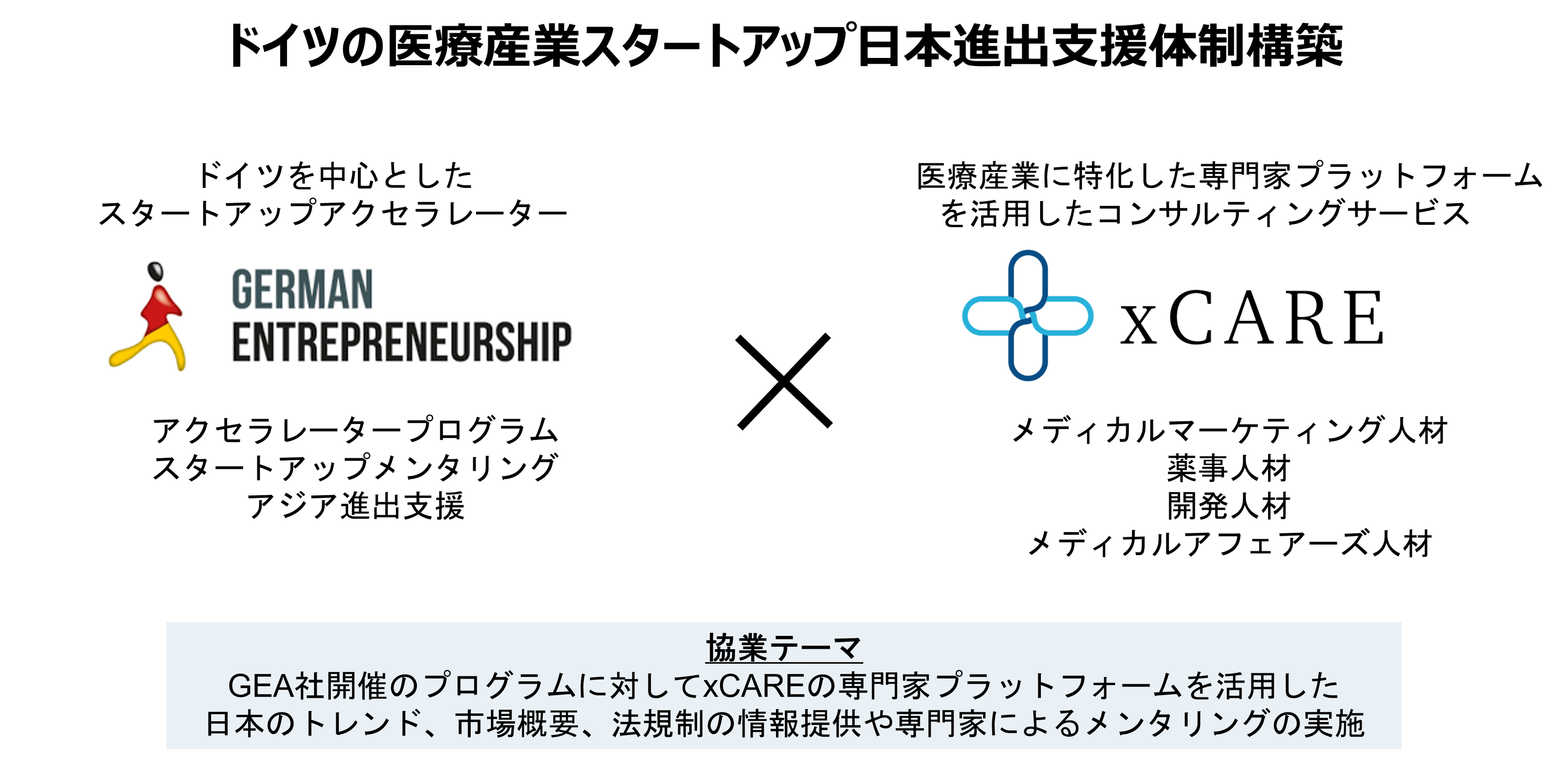 GEA社はドイツのスタートアップ企業の日本進出を支援するアクセラレータープログラムをはじめとした様々なプログラムを実施しています。その提供するプログラムをより充実したものとすべく、xCAREとのコラボレーションに至りました。海外の素晴らしい技術やシーズを専門家プラットフォームの仕組みで日本での事業化をサポートするxCAREの目的にも見合い、両社の提携によって一層双方のアクティビティが活性化することが期待されます。