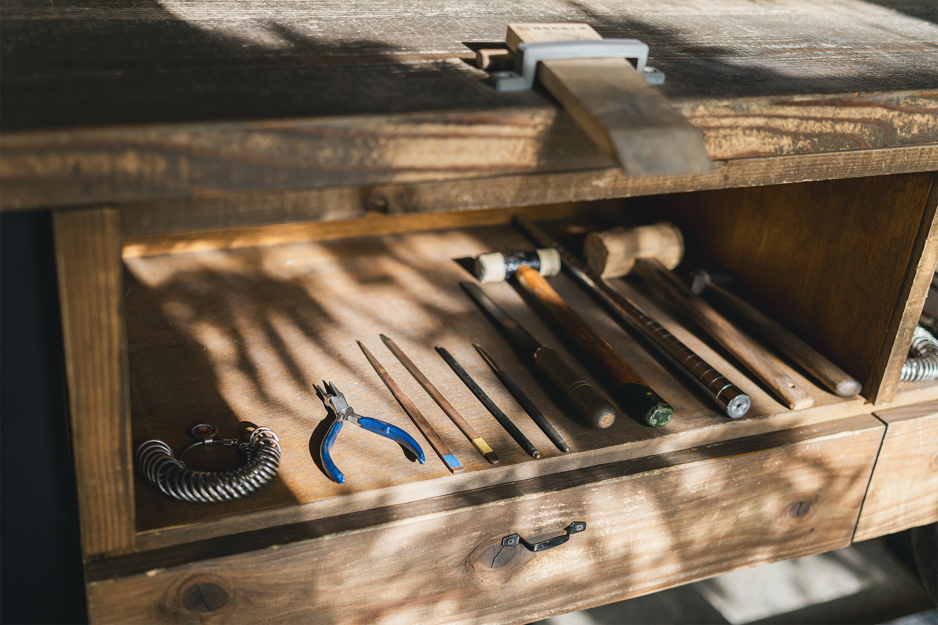 鎌倉と横浜元町に2店舗を展開する鎌倉彫金工房は、手作り結婚指輪・婚約指輪を専門とする工房です。「作る時間も、大切な宝物。」のコンセプトのもと、新婚カップルやパートナーへのサプライズとしておひとりで作られる方を中心に、1本の金属から指輪を手作りいただく体験を提供しています。