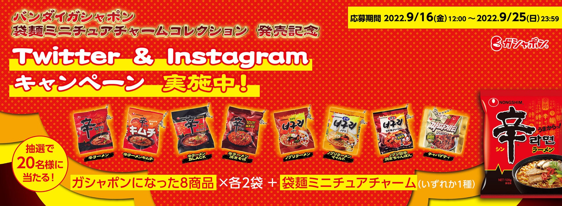 同商品は、辛ラーメンをはじめとした農心の人気商品8種をミニチュア化したもので、全国の玩具売場・量販店・家電店などに設置されたガシャポン自販機にてお求めいただけます。同商品の発売を記念して、9月16日(金)からはSNSキャンペーンを開催致します。Instagram・Twitterからどなたでも応募可能で、抽選で合計20名様にガシャポンになった袋麺の詰め合わせ(全8種各2袋)と袋麺ミニチュアチャーム(いずれか1種)が当たります。