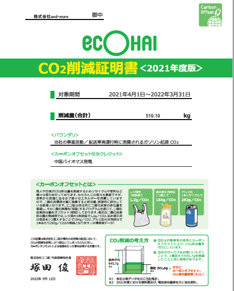 主たる配送手段に自転車を活用し、自動車を持たざるを得ないエリアについては、カーボン・オフセット・クレジットの購入により、温暖化ガスの排出枠を購入し、排出されるCO2の量を事実上ゼロとする、環境にやさしい配送業者です。