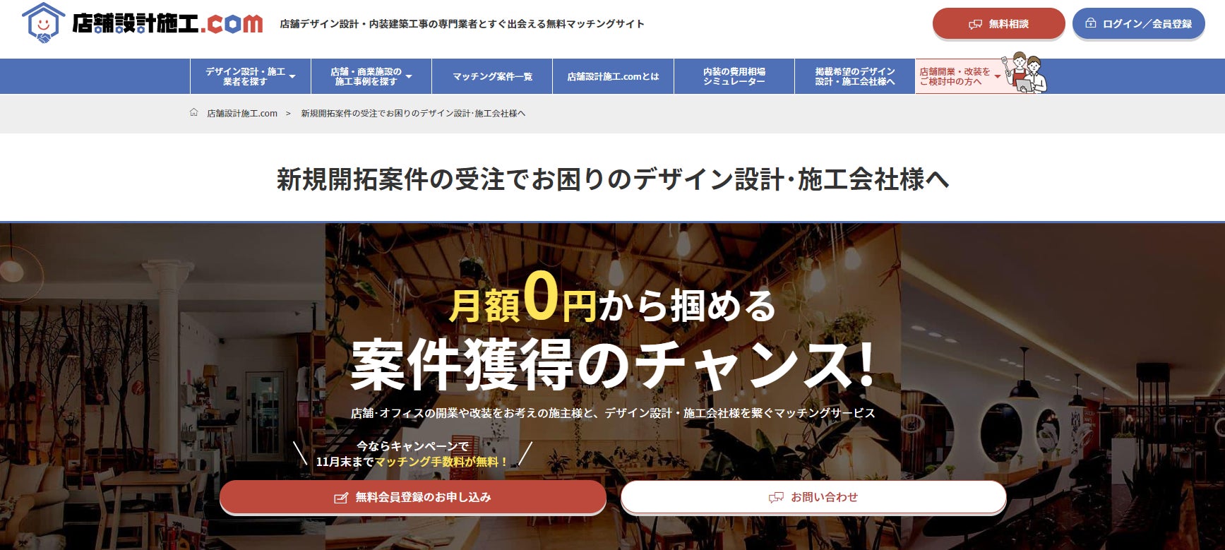 新規開拓案件の受注でお困りのデザイン設計・施工会社様は、当サービスにお任せください。皆様のご利用をお待ちしております。