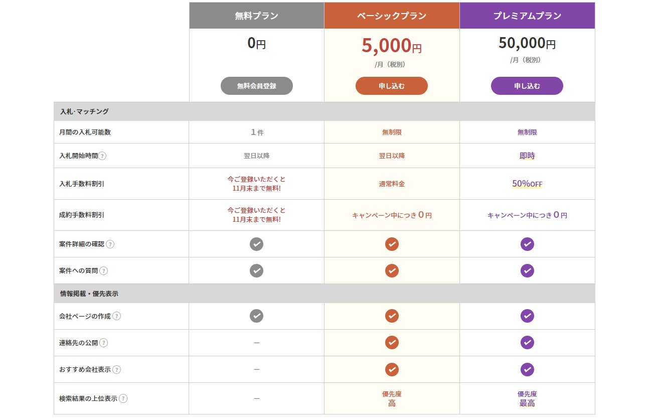 入札制限なし・成約手数料割引・連絡先公開可能など様々な特典がついた上位プランもご用意しております。