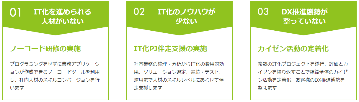 具体的には「AppSheet」、「PowerAutomate」、「PowerApps」、「IFTTT」などのノーコード開発ツールを使用して、お客様の社内人材をリスキリングし、ノーコード開発人材へと育成することでお客様企業のIT内製化を支援いたします。