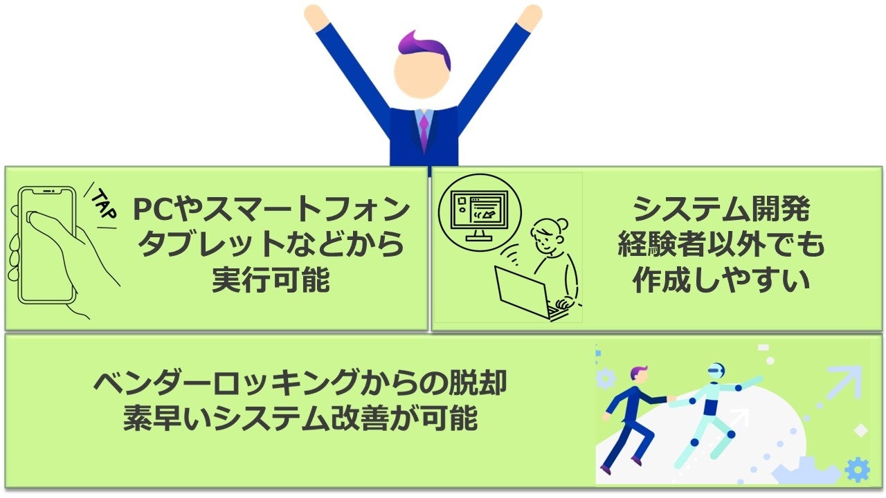 「ノーコード開発ツール」では高度な技術は不要なため、システム開発の経験がなくてもサンプルアプリケーションやテンプレート・パーツを組み合わせることにより高品質なアプリケーションの作成が可能であり、業務担当者が開発を行うことで業務要件を正しくアプリケーションに反映させることができ、開発後に新たに発生した要件や要件変更についても素早く反映させることが可能です。また、リソースやロジックなど実行に必要な要素はすべて格納されているので、ベンダー依存からの脱却も期待できます。そしてマルチプラットフォームに対応していることから、PCやスマートフォン・タブレットなど実行する端末に合わせてのアプリケーションの書き換えが不要な点も大きなメリットです。