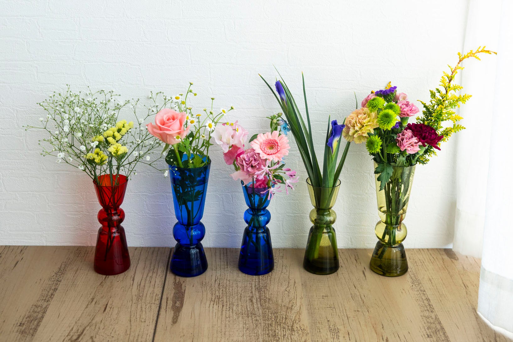 お申し込みのプランによってお届けする花瓶のサイズが異なります。カラーは、どちらのプランを選んでも3色(YELLOW / RED / BLUE)から1つ、お好きな色の花瓶をお届けいたします。