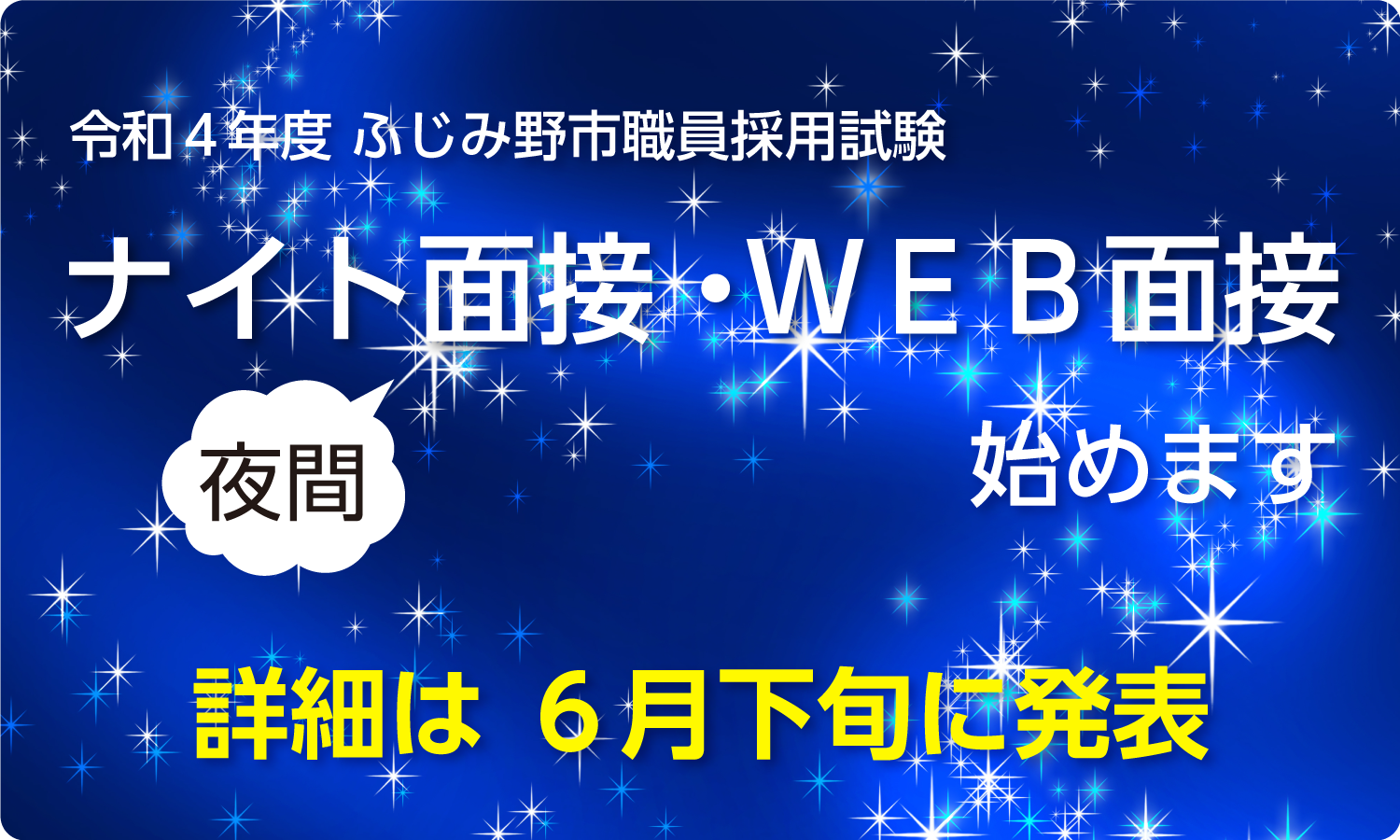 令和4年度ふじみ野市職員採用試験では、ウィズコロナ時代を生き抜く受験生のさまざまな生活スタイルに応えるため、ナイト面接とWEB面接を併用する新しい受験スタイルを用意しました。