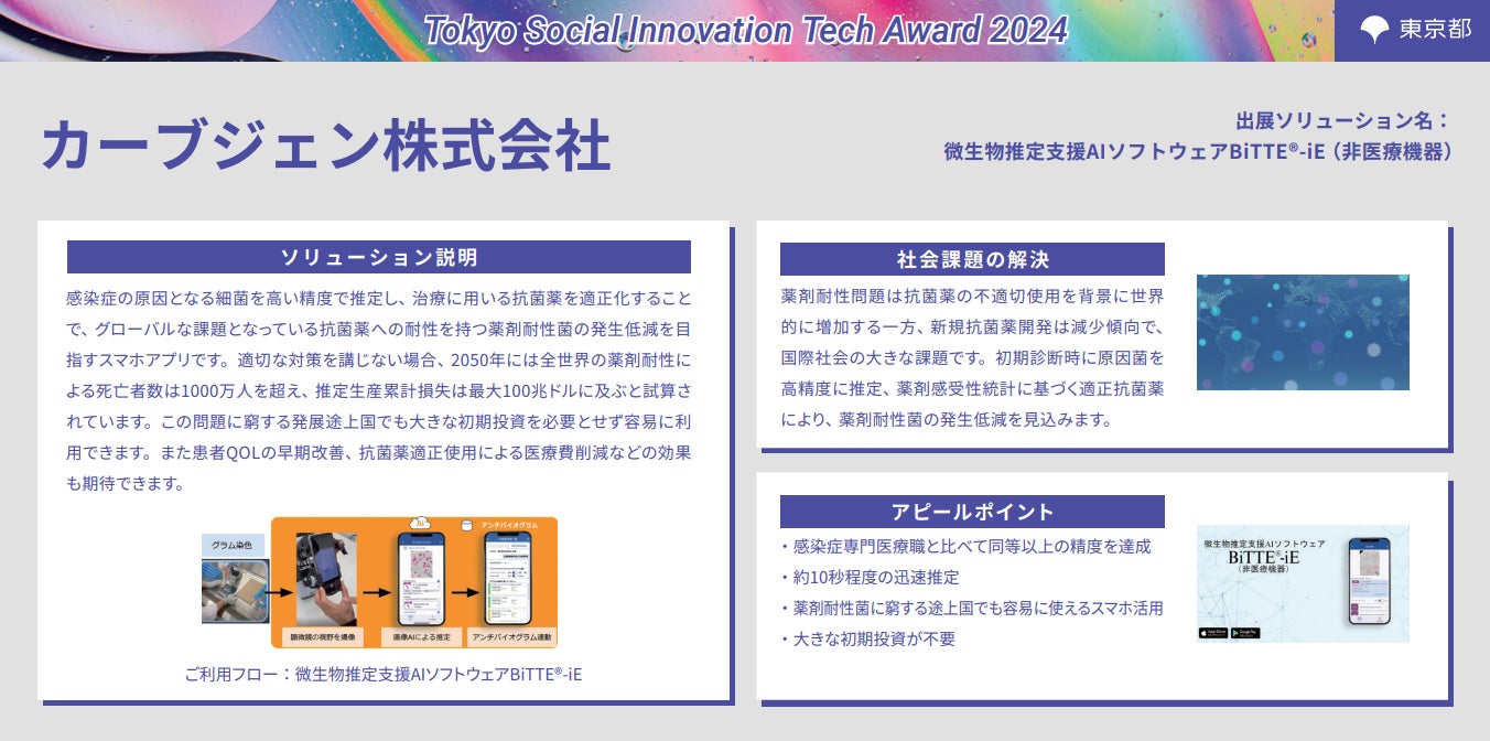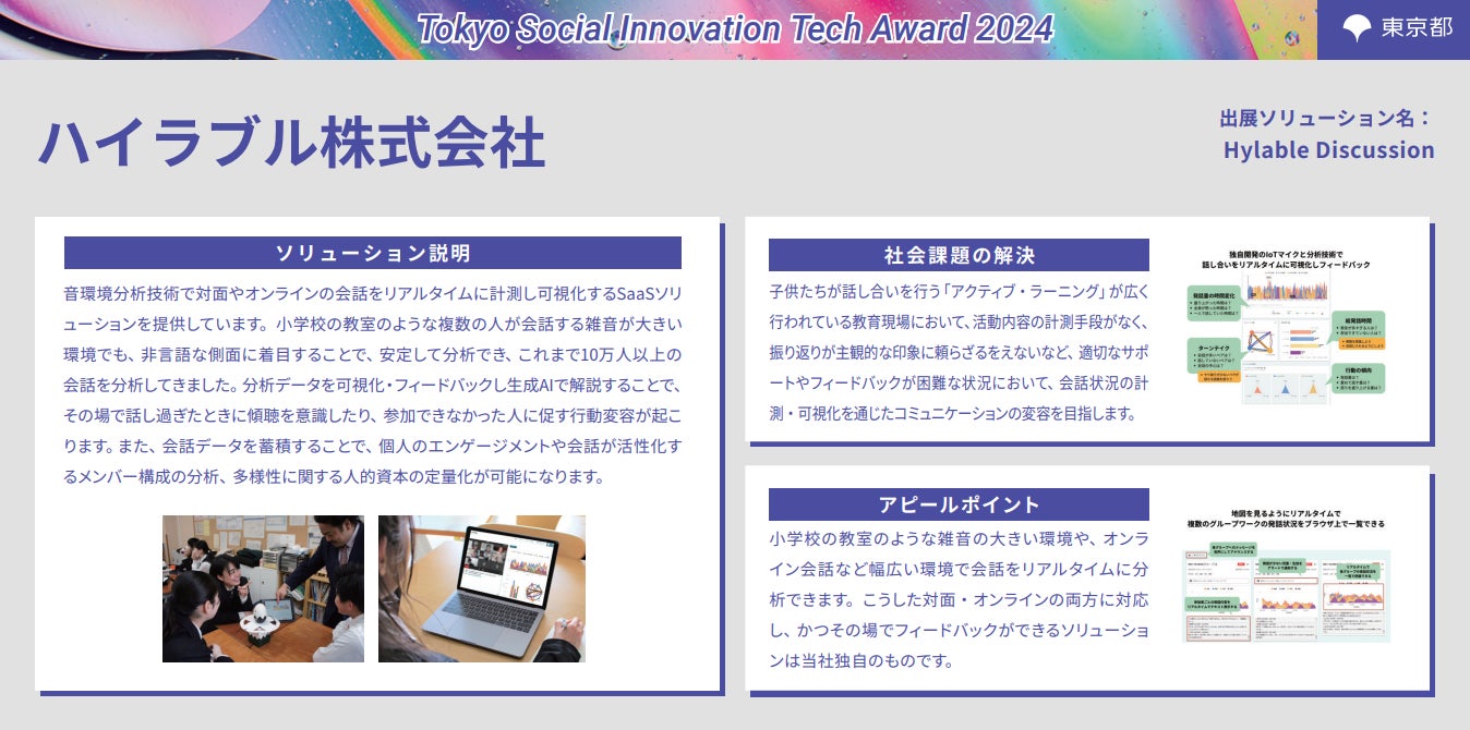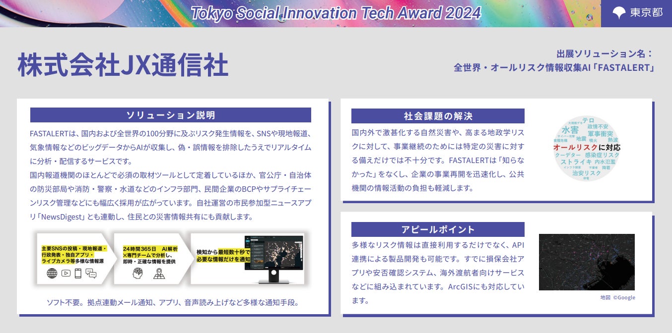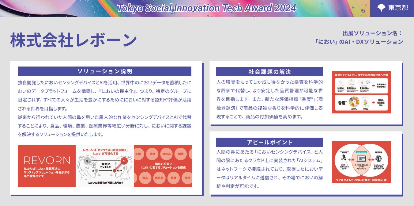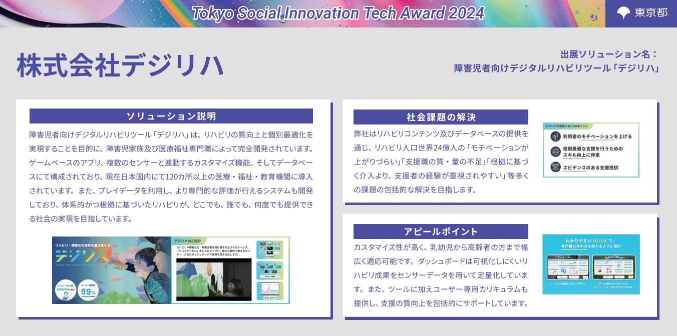 昨年まで実施していた「Tokyo Contents Solution Business Award」から内容をアップデートした「Tokyo Social Innovation Tech Award 2024」は、都内中小企業が有する優れたソリューションを評価・選定し、事業連携先のマッチング支援等を行うことで、その普及を後押しし、都が抱える社会課題解決の加速化を図ることを目的として開催いたしました。事業初年度となる令和6年度は107件の応募があり、その中から特に優れたソリューション等11件が受賞となりましたので、お知らせします。