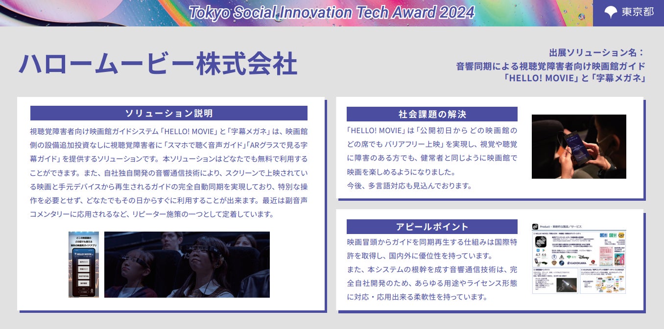 ソリューション名:音響同期による視聴覚障害者向け映画館ガイド「HELLO! MOVIE」と「字幕メガネ」(XRメタバース分野)