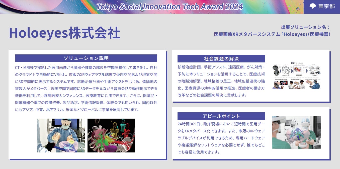 ソリューション名:医用画像XRメタバースシステム「Holoeyes」(医療機器)(XRメタバース分野)解決を目指す社会課題:医療技術の形式知化による地域医療格差是正・コミュニケーション改善・医療資源の効率活用