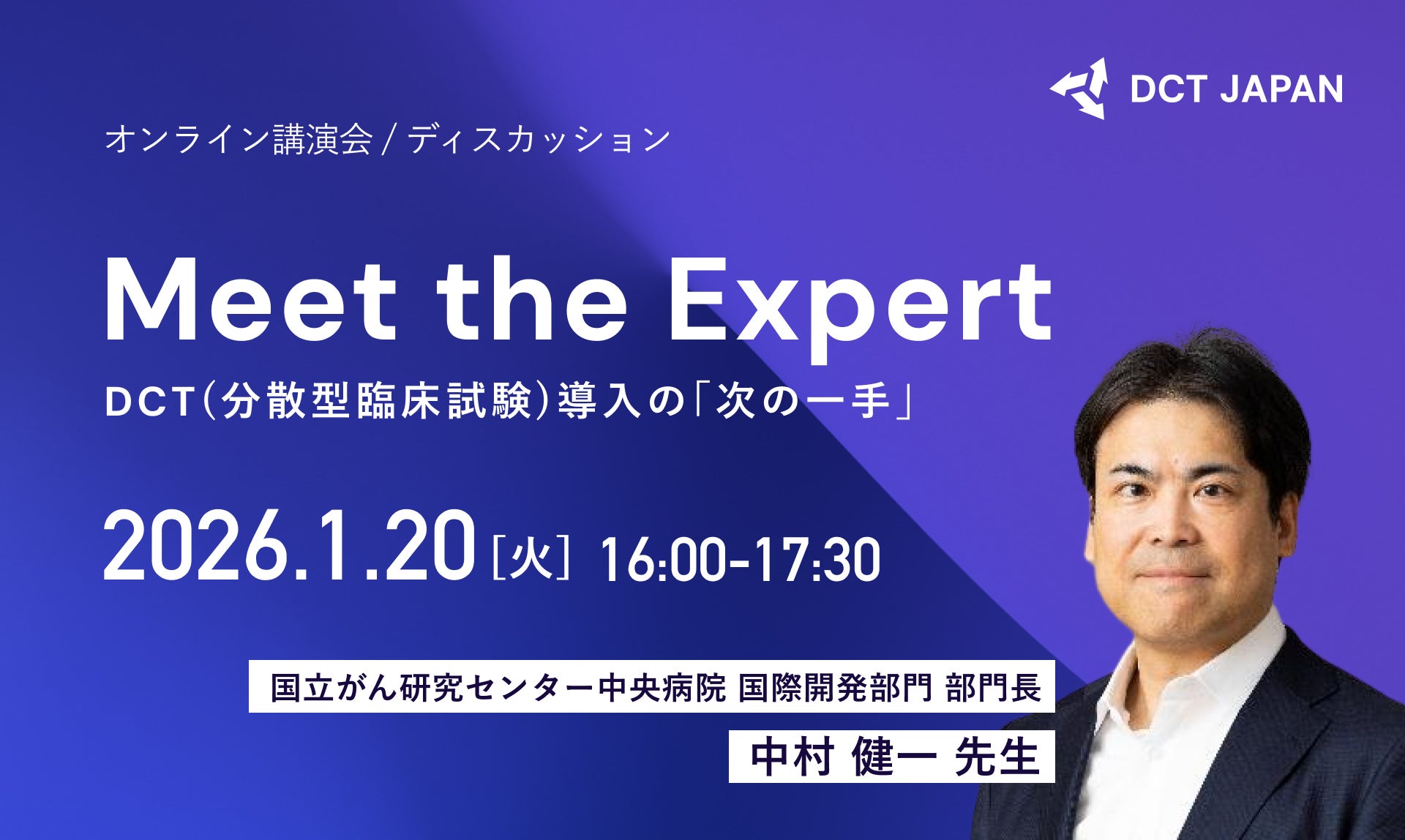 株式会社DCT Japan(本社:東京都中央区、代表取締役社長:武藤真祐、以下「DCT Japan」)は、DCT(分散型臨床試験)の啓発イベント「Meet the Expert: DCT導入の「次の一手」」を開催する運びとなりましたのでお知らせいたします。