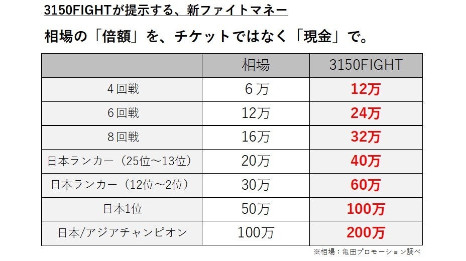 「3150FIGHT」出場選手には、従来の相場のファイトマネーの「2倍」の金額を「現金」で支給する。