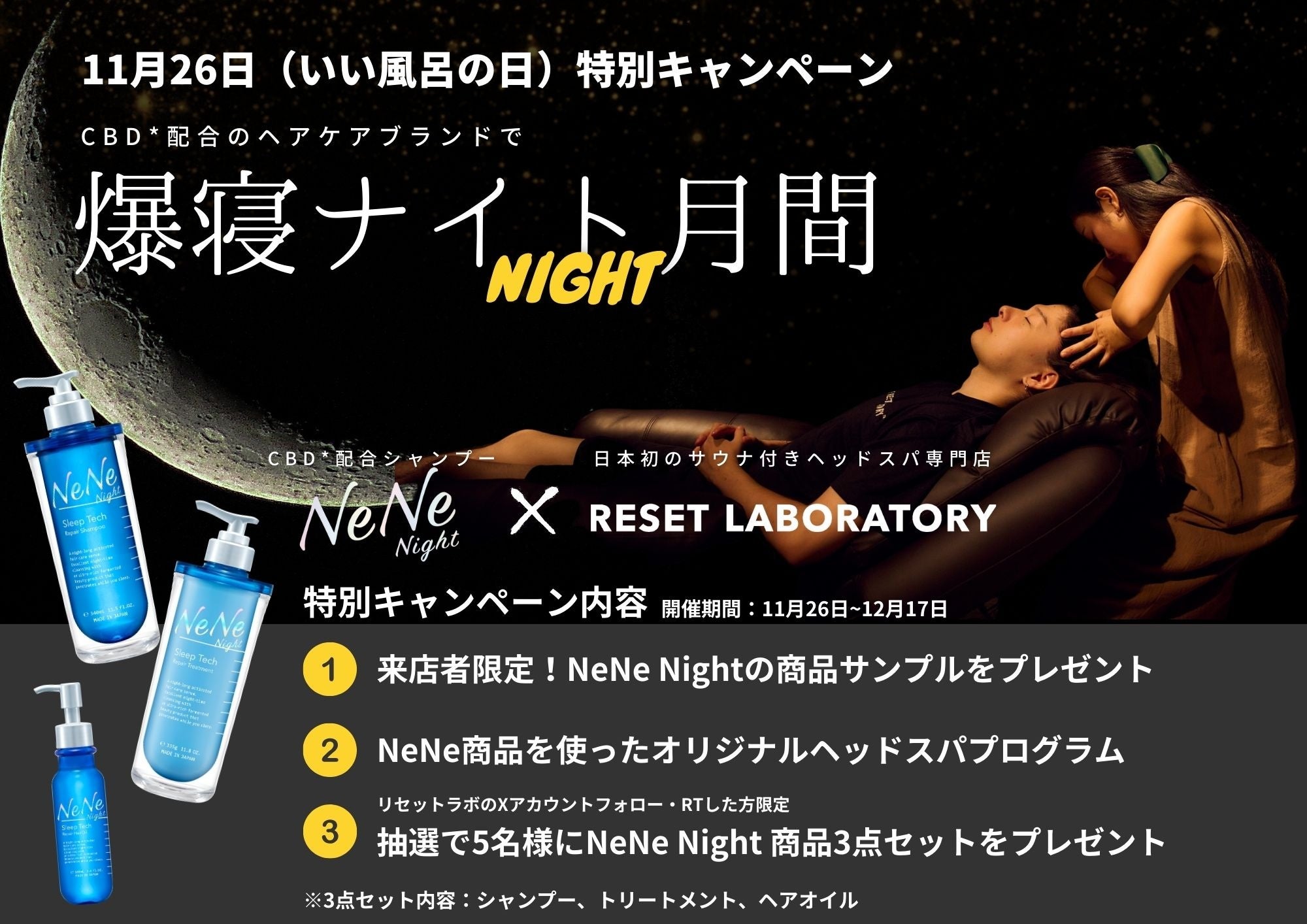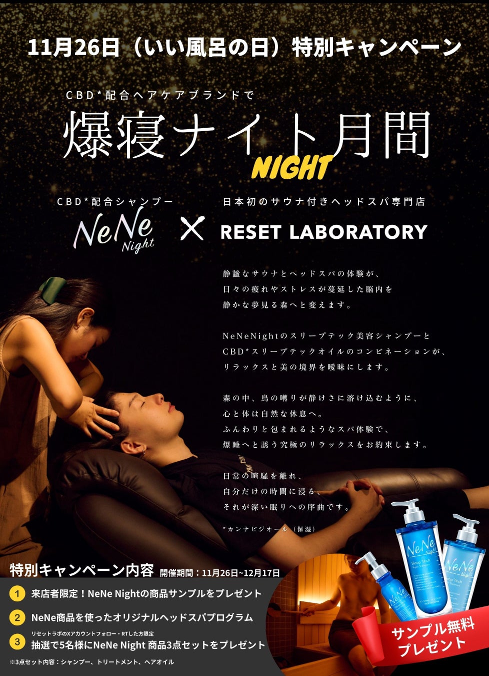 CBDヘアケアブランド「NeNe Night」とサウナ付きヘッドスパ専門店「RESET LABORATORY」が期間限定でコラボ!“いいふろの日”(11月26日)に「究極の寝落ちCBDスパ」企画を開始