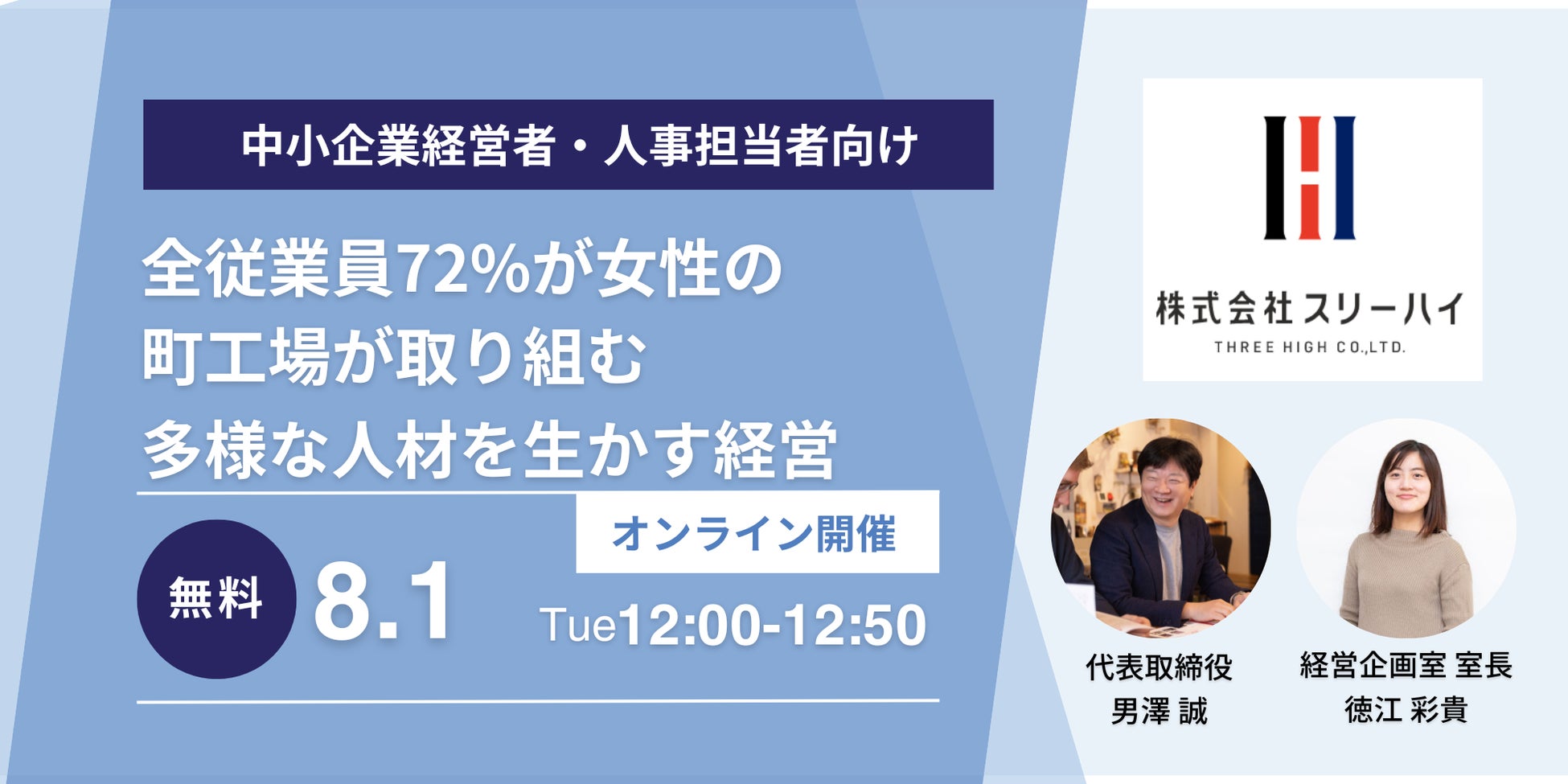 本セミナーでは、当社代表の男澤と経営企画室長の徳江のパネルディスカッションから、子育て世代を中心としたスリーハイの多様な社員を生かす取り組み、取り組むにあたってぶつかった壁、それをどのように乗り越えているか等、町工場の等身大の姿をお話いたします。