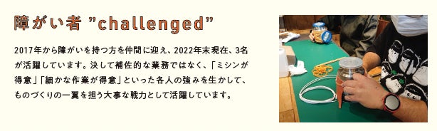 そこで、少ない人数、また育児や障がいなど様々な事情がある従業員の「得意」を生かした経営を進めていったところ、女性が全従業員の72%を占めるまでになりました。さらに、2017年から障がいを持つ方を仲間に迎え、2022年末現在、3名が活躍しています。決して補佐的な業務ではなく、「ミシンが得意」「細かな作業が得意」といった各人の強みを生かして、ものづくりの一翼を担う大事な戦力として活躍しています。