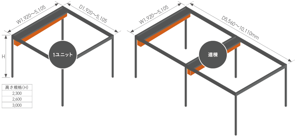 出巾(D):1,920〜5,105mm(連棟 5,560〜10,110mm)