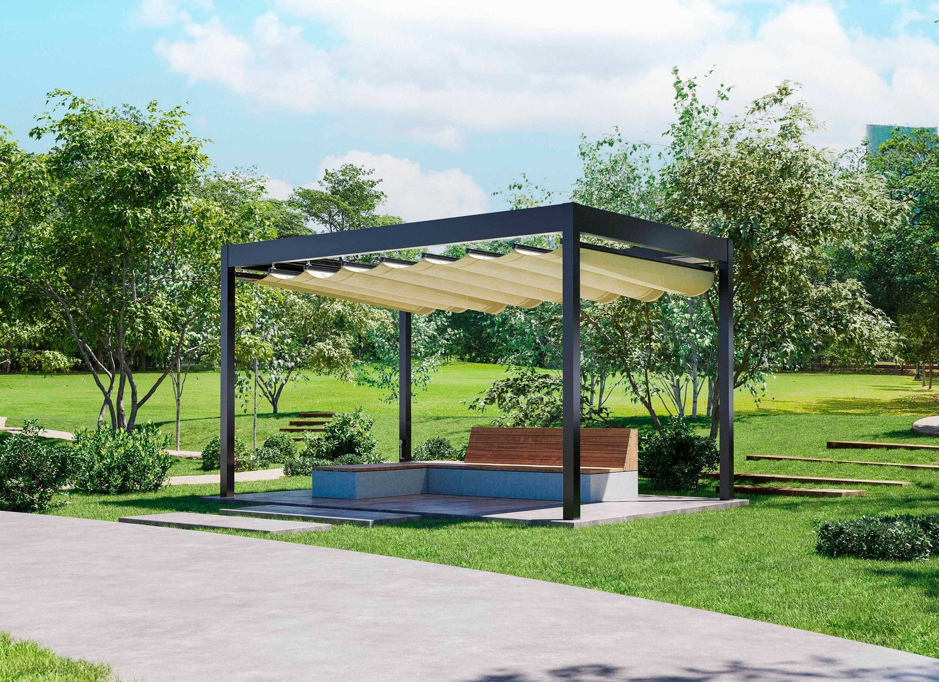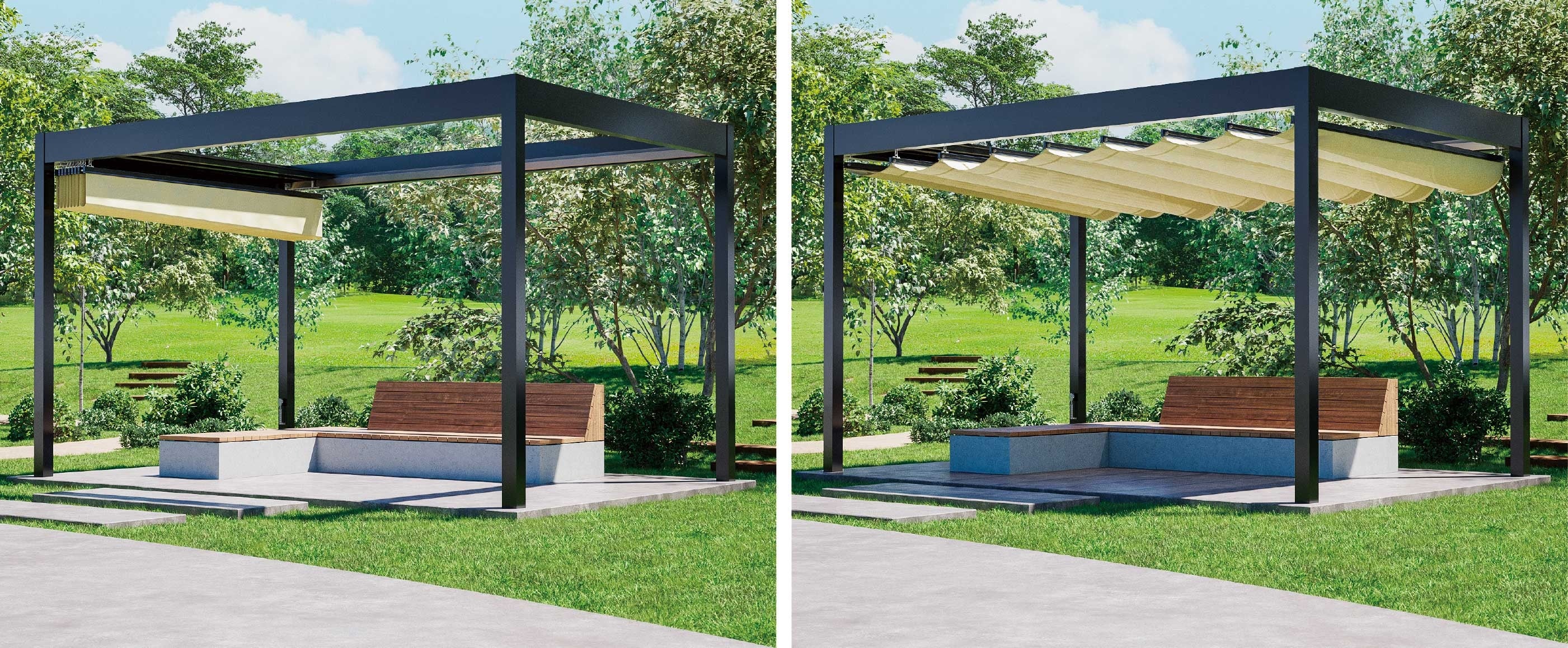 凹凸のないスマートなアルミフレームに、キャンバスの可動部材が外から見えにくいスマートな構造。景観に馴染む美しいデザインです。