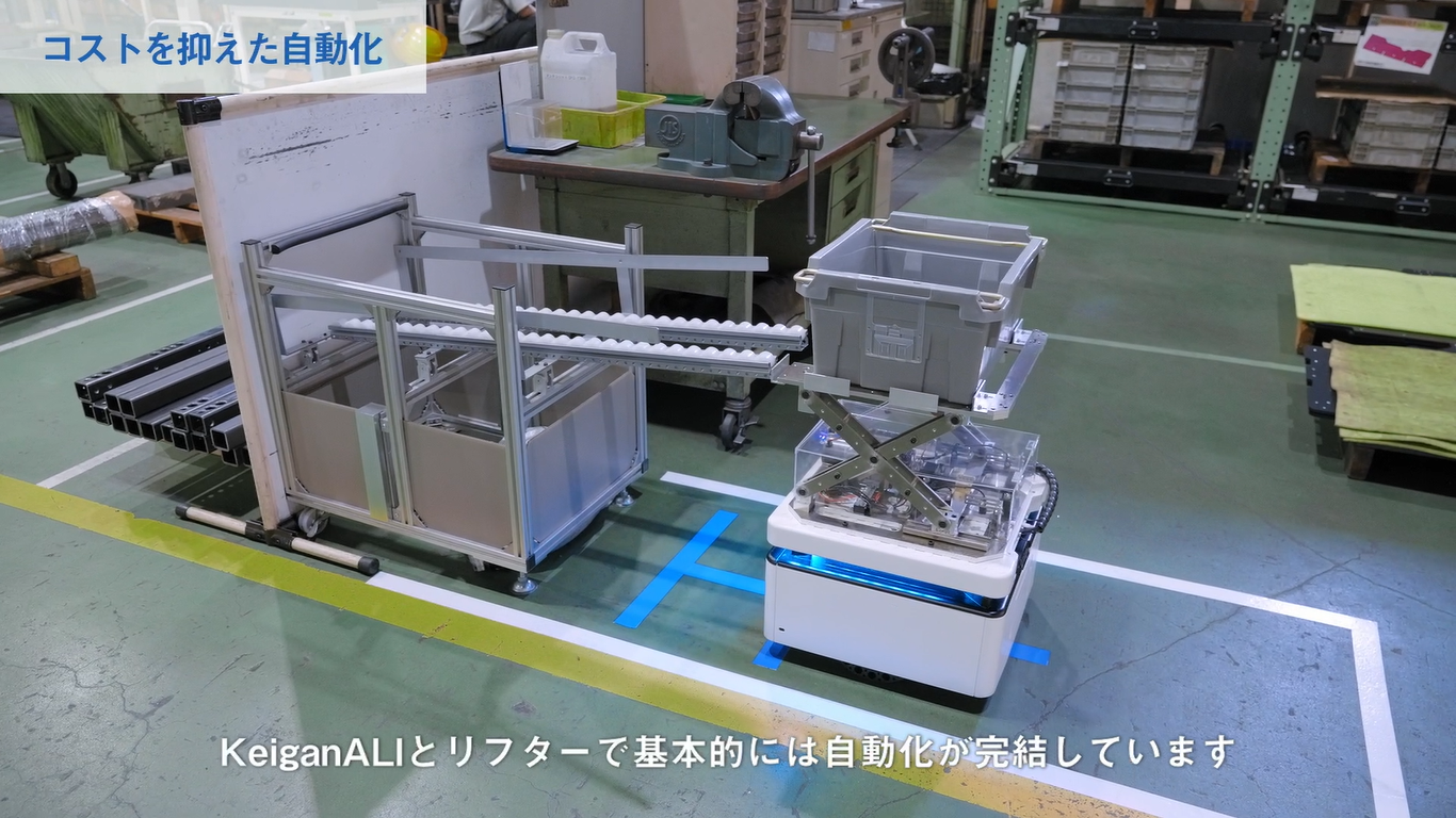 株式会社ホリゾン様は製本機器業界で世界トップクラスのシェアを誇るメーカーであり、自社工場での自動化のノウハウを活かしたSIerとしての事業も展開されています。KeiganALIと上部アタッチメントのシステム連携を自社で開発し、部品加工の工程間搬送を自動化。リードタイムを短縮しました。自社工場での導入を通し、AMRを活用した新たなソリューションの提供も検討されています。