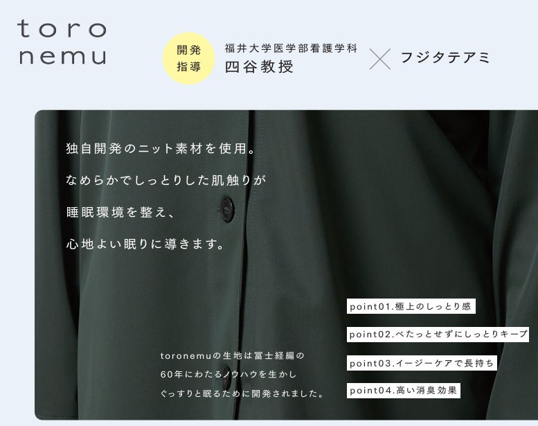 「トロネム toronemu by millevies」は、生地とデザインの両方の視点から、 「気持ちよく過ごし、 ぐっすり眠る」ための工夫が盛り込まれています。睡眠に悩むシニア世代の手助けになる睡眠着です。
