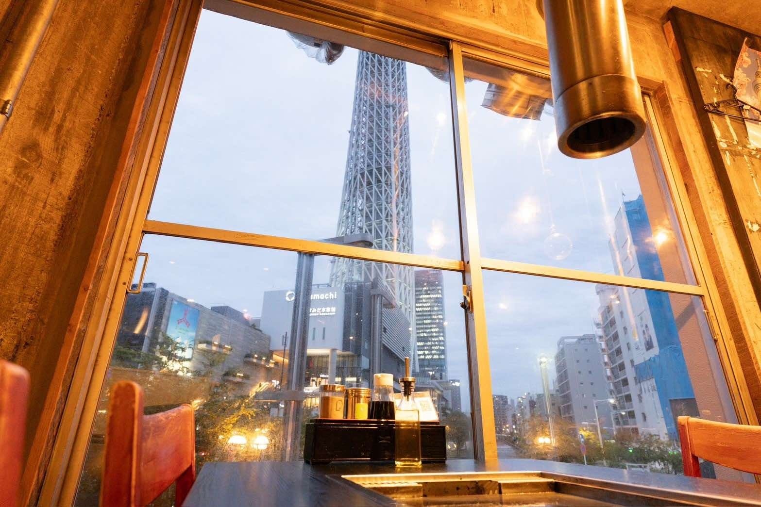 目の前に広がるスカイツリーの絶景を眺めながらのお食事もおすすめです。特別な景色を楽しみながら、下町の味を堪能できます。