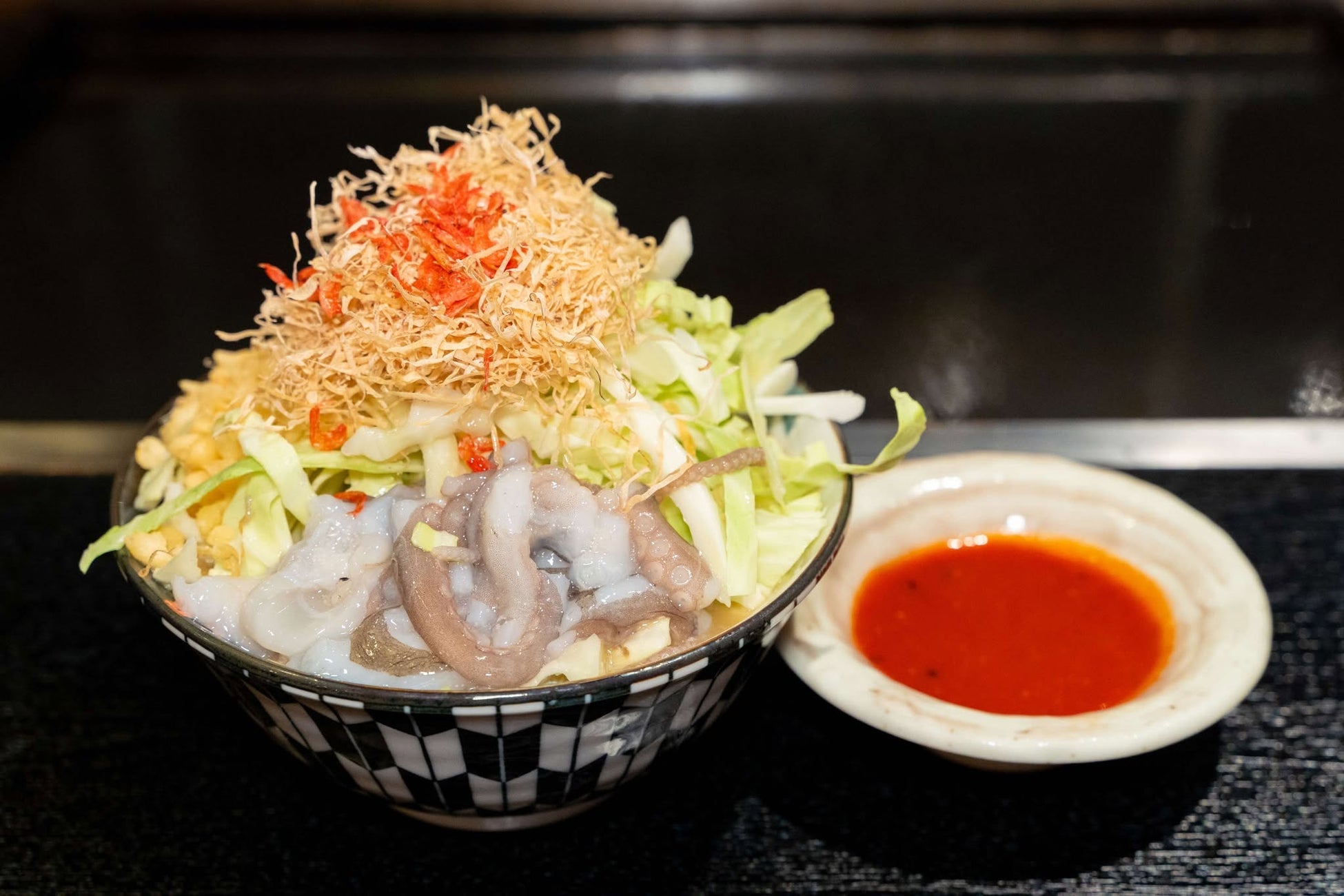 韓国から直送された活手長タコが丸ごと1匹入った活タコもんじゃ。超新鮮な生きたタコがニュルニュル動く、ここでしか味わえないオリジナルもんじゃです。タコの旨味がぎゅっと詰まった、新感覚の美味しさを堪能してください。
