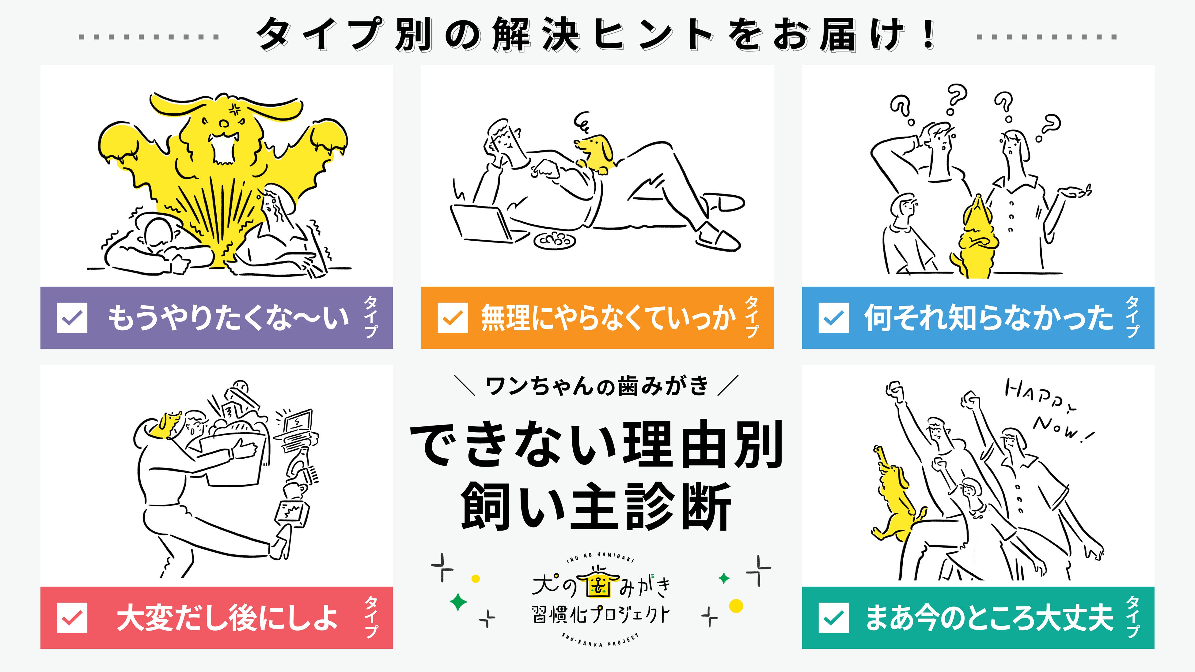 「犬のオーラルケア」に興味のある飼い主さん向けに、失敗した理由やできない理由をチェックするだけで全5つのタイプ別診断ができ、それぞれの飼い主さんに合わせた“解決ヒント”をお届けする、お助けコンテンツを展開中。