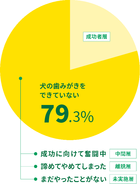 理由としては、ワンちゃんが嫌がる・吠える・噛むなど… 多くのトラウマも浮き彫りに。 また、オーラルケア「成功者層」は全体のわずか20.7%、一方で、成功に向けて奮闘する「中間層」、諦めてやめてしまった「離脱層」、まだやったことがない「未実施層」が約8割という結果に。そこからは、「ワンちゃんが嫌がらなければいいのに…」「自分の知識不足を感じる」という本音も聞こえてきました。