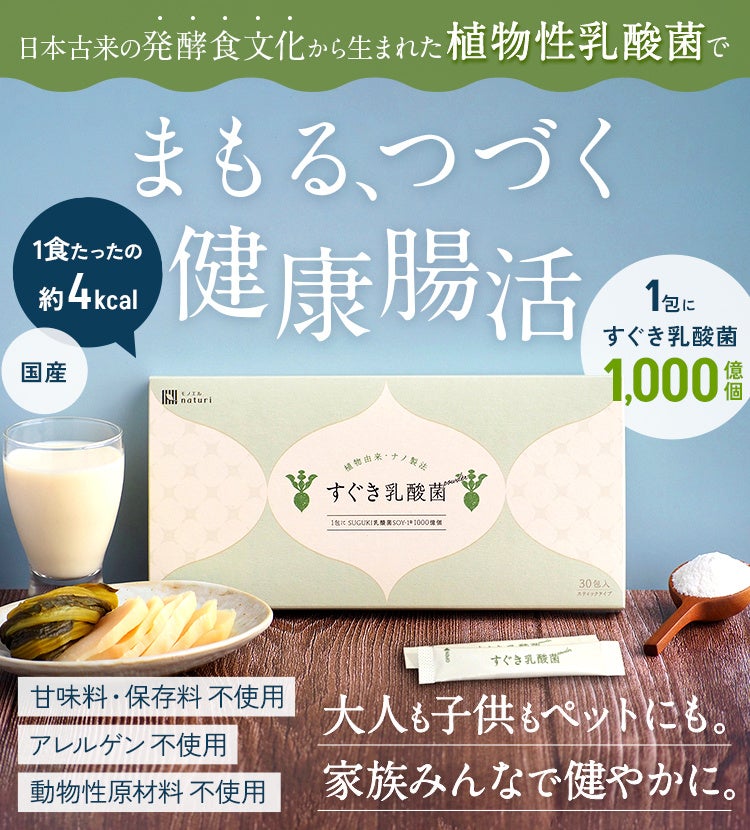 日本人のカラダには、やっぱりニッポンの乳酸菌が合う!すぐき漬けの力強い乳酸菌〈SUGUKI乳酸菌SOY-1®〉1000億個配合でまもる。無風味だから飽きずにつづく。しかも1食たったの約4kcal。