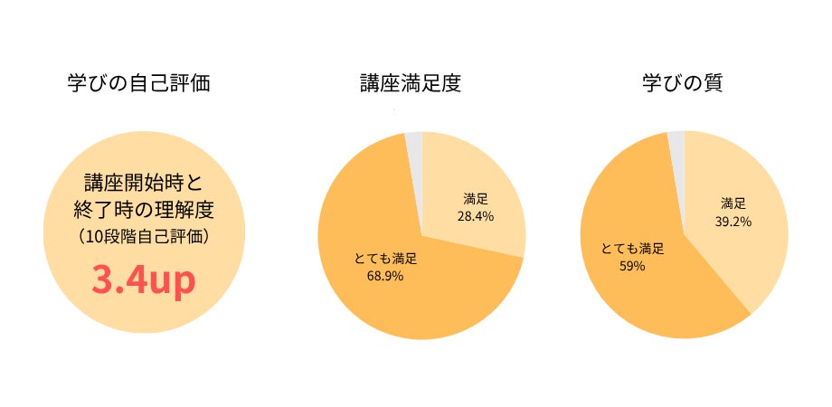 各講座ごとの講座テーマに関する理解度(自己評価)は、講座開始時と終了時(10段階評価)で、平均3.4ポイントUP。講座の内容に関するの評価(各講座アンケート平均)を一部抜粋すると、講座満足度:97.3%、学びの質:98.2%となりました。