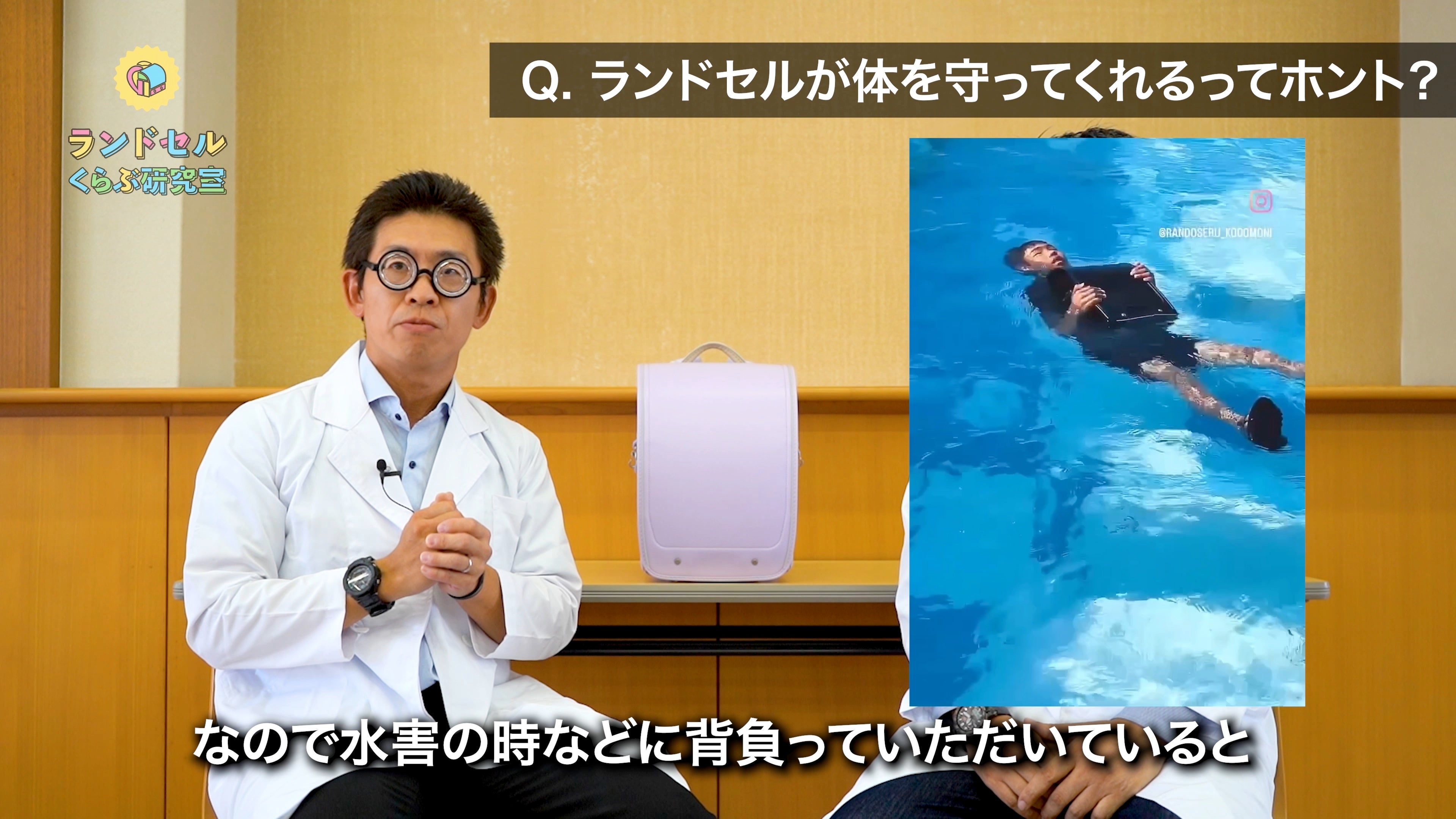 登下校中にお子様が事故に遭い、転倒した際、ランドセルがクッションがわりになり頭を打たなかったという事例が報告されています。また、ランドセルは教科書が入っていても水にも浮くという実験結果も出ており、水害に遭遇した場合でもビート板がわりになります。このようにランドセルはあらゆる面からお子様の体を守ってくれます。防災に役立つランドセルの使い方も動画内で詳しく解説していますので、ぜひチェックしてみてください。