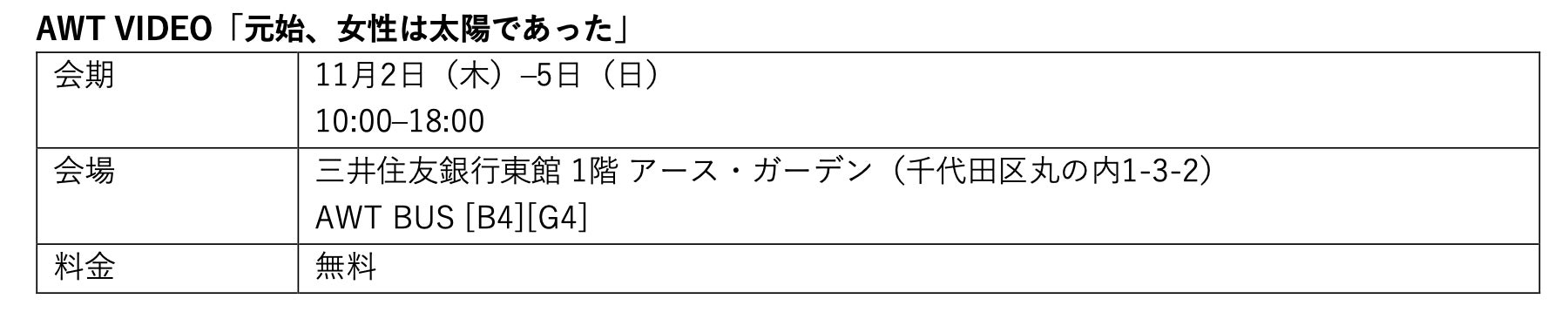 ■ 映像作品プログラム AWT VIDEO。今年は「ジェンダー」と「自然」をテーマに、思想家・平塚らいてうの自伝からインスピレーションを得て「元始、女性は太陽であった」をタイトルに掲げます。