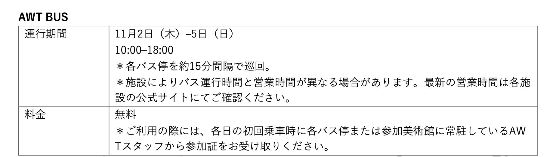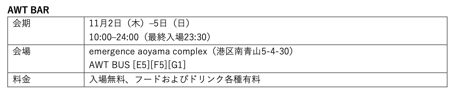 シャトルバス全7ルートや新企画「買える」展覧会 AWT FOCUS、フードが加わり更なる進化を遂げたAWT BARなど充実のプログラムハイライトを一挙公開!