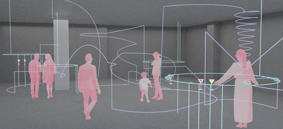 「ものの外側やその間には空気の流れや滞りがある」と考える山田は、もののアウトライ ンだけを取り出すアプローチとして、直径13ミリのスチールパイプを用いてこれらを可視 化しました。宙に浮かぶラインの内と外を人々が自由に行き交うことができ、バーとしての役割を超えた社交場として機能します。AWT BARの設計に加えて、AWT FOCUSの会場設計も山田が手がけます。