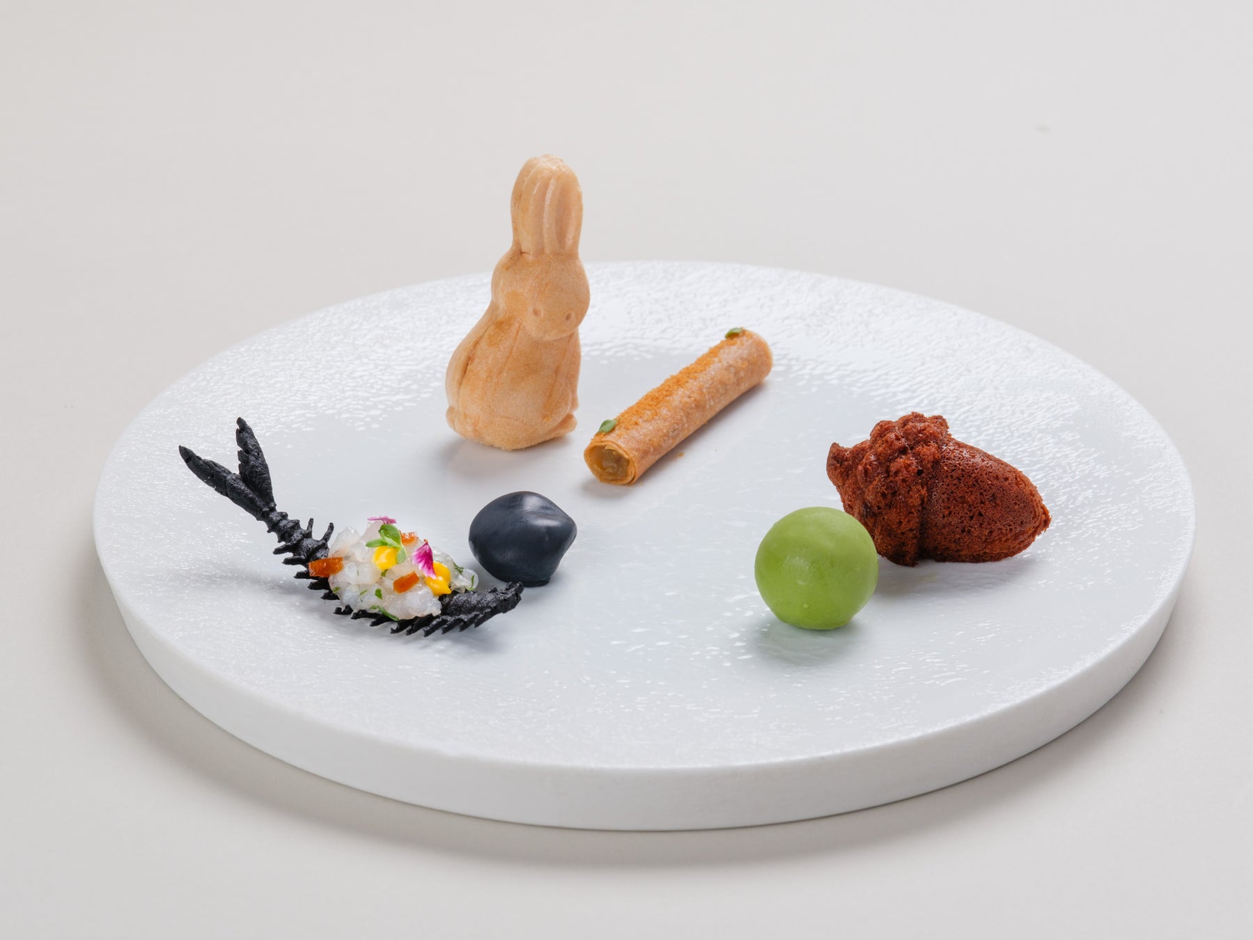 画像手前左から:「海(消えゆく魚&石のようなチョコレート)」、「山(マスカットのようなフォアグラ&甘いどんぐり)」、「森(う さぎの最中&焼き芋のチュイル)」各1皿1,000円