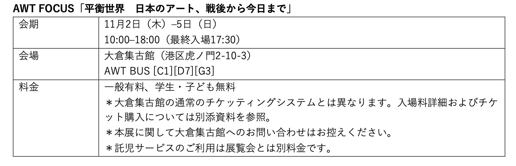 「平衡世界 日本のアート、戦後から今日まで」を展覧会名に掲げる「買える」展覧会 AWT FOCUSの出展作家を発表。現代アートがより身近に感じられる鑑賞ツアーなどを実施。