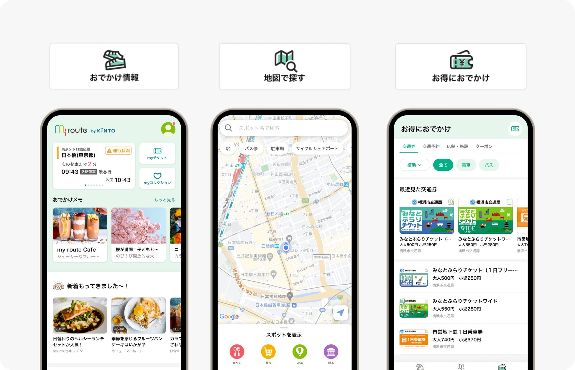 「近くの行きたい場所やイベントが見つかる」、「TVや雑誌、WEBサイトで見つけた行きたい場所、お友達のおすすめお出かけ先が保存できる」「様々な交通手段を組み合わせた行き方が検索できる。」
