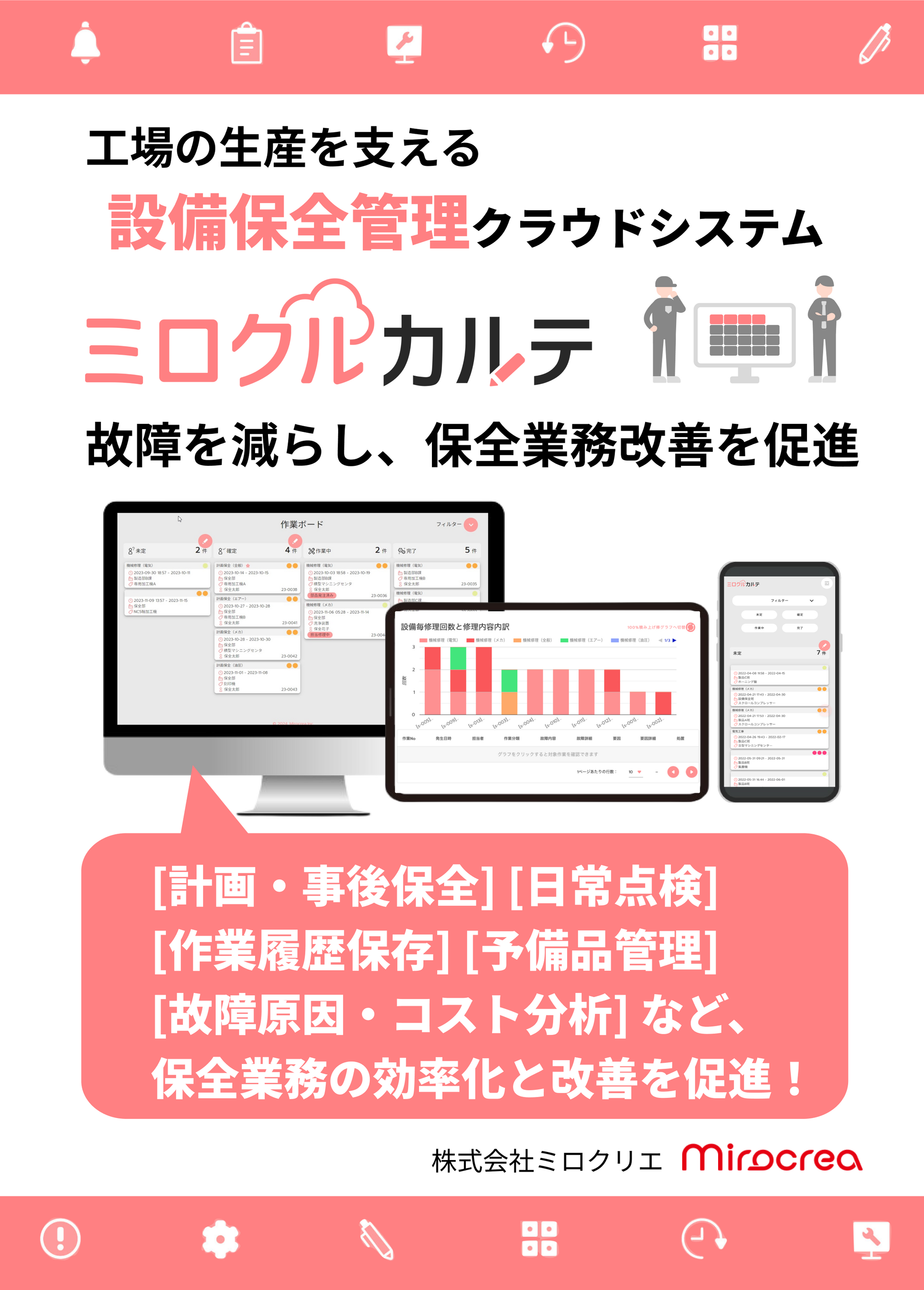 「ミロクルカルテ」は、現場の声を大切にしながら、自社工場で改良を重ねてきた設備保全ツールです。シンプルで使いやすいデザインと、保全業務に必要な機能を両立。直感的に操作できるから、誰でもすぐに使えます。