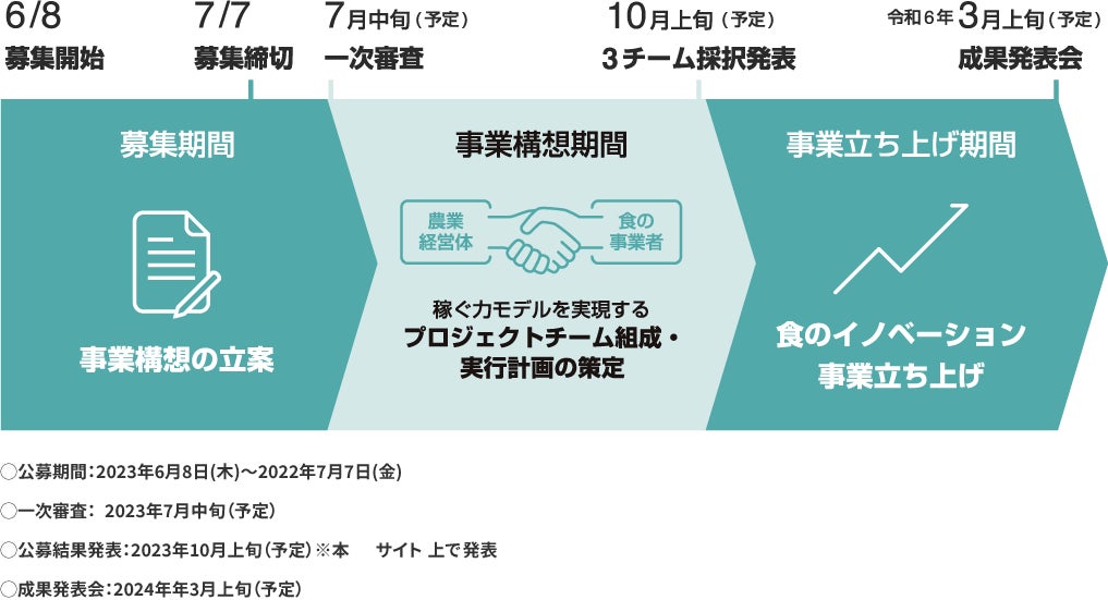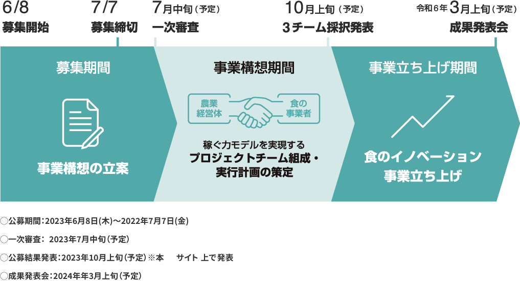 初の試みとなった昨年度では多種多様な事業者へのヒアリングを通じて、食のバリューチェーン全体のリアルなニーズ・課題を発掘し、食の「稼ぐ力」を高める事業モデルの仮説を構築する一歩を踏み出しました。その仮説をもとに3チームを採択し、新たな事業創出を支援してまいりました。この第1期採択チームから食の「稼ぐ力」向上の兆しや可能性が生まれてくる中、この成果をさらに加速・拡大させるべく、今年度も食のイノベーションに取り組む意欲的な事業者と共にプロジェクトチームを組み、イノベーション事業の創出に挑戦します。これを通じて、県内産業の振興に寄与する「稼ぐ力」のビジネスモデルの創発を目指します。
